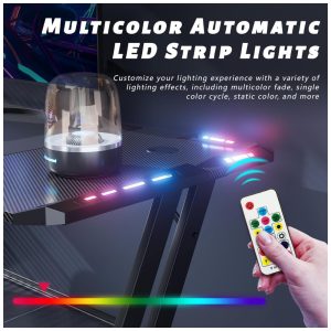 Com a capacidade de suportar até 68,03 kg, a mesa garante uma base sólida para equipamentos pesados. As almofadas dos pés podem ser ajustadas verticalmente em até 1 cm para assegurar estabilidade adicional. A mesa também conta com iluminação RGB controlada por um controle remoto, além de um revestimento de fibra de carbono que é à prova d’água e resistente a arranhões.