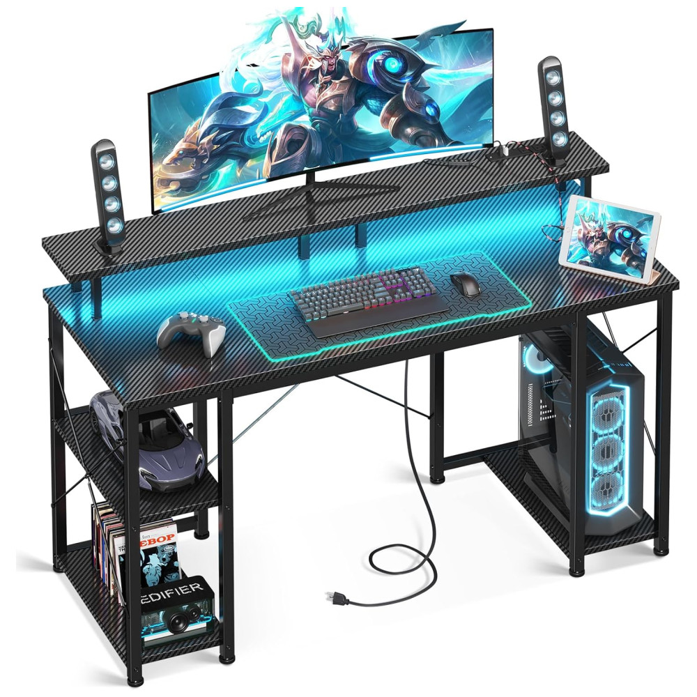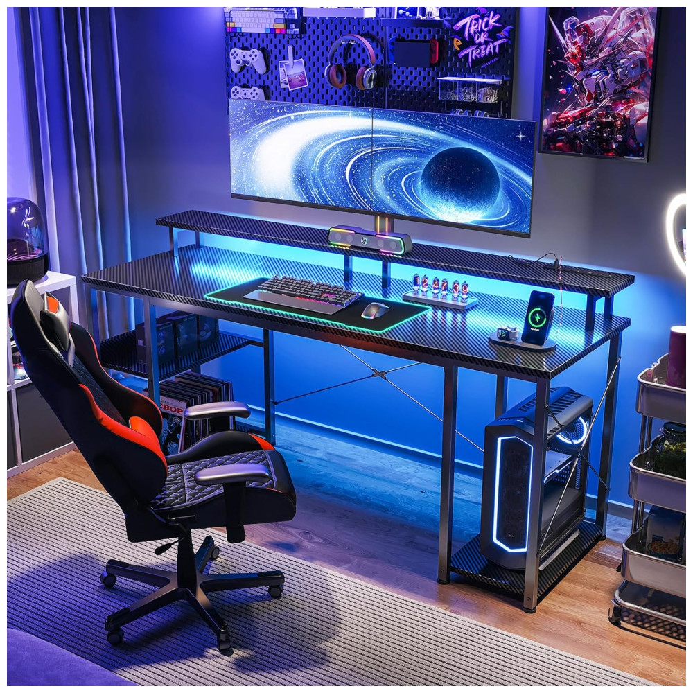 Esta mesa gamer é perfeita para gamers e usuários que buscam uma solução multifuncional. Com um suporte de monitor completo, acomoda dois monitores ou laptops, proporcionando um ambiente de jogo forte com iluminação LED integrada. A mesa possui porta USB integrada para carregamento e prateleiras reversíveis para suporte de PC. Além disso, conta com um gancho para seus fones de ouvido, deixando tudo o que você precisa ao seu alcance. Construída com uma estrutura de metal premium e aglomerado espesso, garante estabilidade e durabilidade, e uma barra transversal X adicional melhora a estabilidade desta pequena mesa. Disponível em diferentes tamanhos, oferece amplo espaço para as pernas e é ideal para trabalhar, escrever, estudar ou jogar. A mesa é fácil de montar e vem com todas as ferramentas e instruções necessárias.
