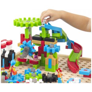 A estrutura é fabricada em madeira compensada de bétula, com acabamento resistente e de fácil limpeza, adequada para uso em ambientes domésticos, escolares e espaços de aprendizagem compartilhados. O conjunto inclui mesa, 200 peças entre engrenagens, trilhos, personagens IO, peças padrão IO Blocks e 2 caixas organizadoras transparentes para armazenar os componentes. O tampo com grade integrada ajuda a manter as construções firmes, favorecendo atividades de experimentação com equilíbrio, movimento e associação de formas.