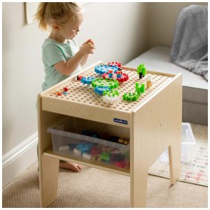 Conteúdo da embalagem: 1 mesa de atividades em madeira, 200 peças IO Blocks, 2 caixas organizadoras transparentes, ferragens, ferramentas e manual de montagem