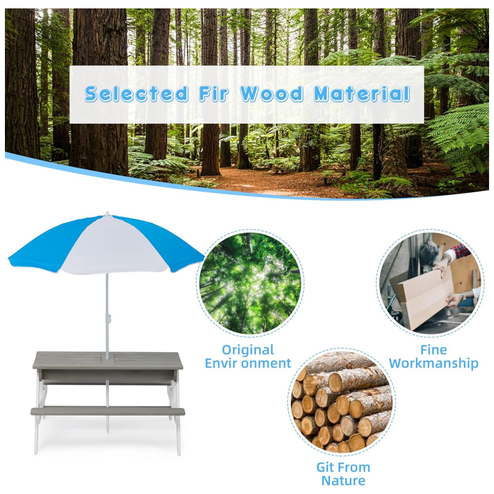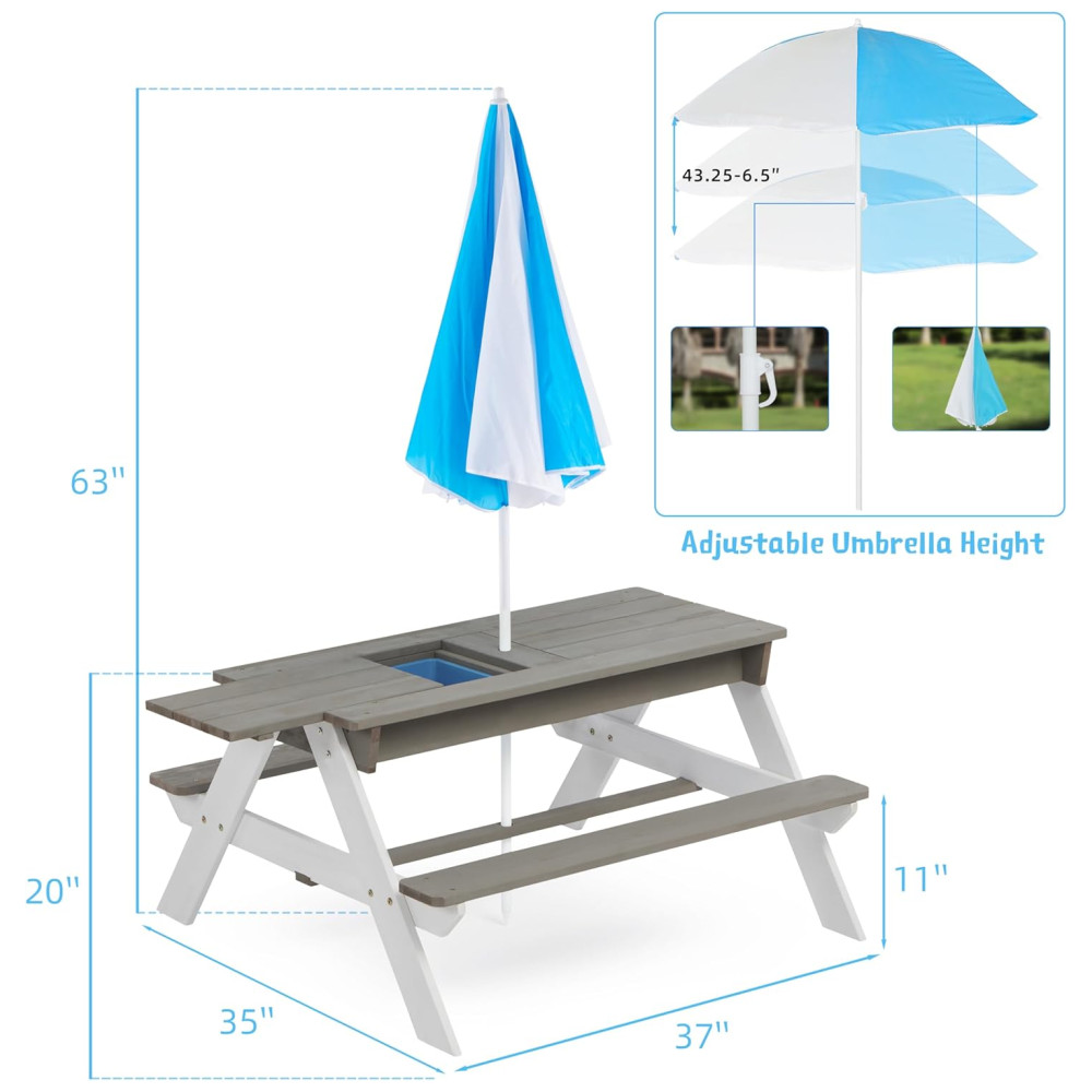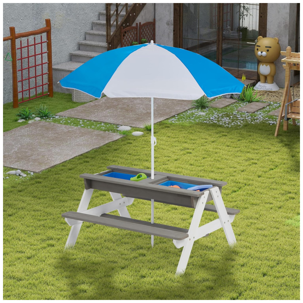 É uma mesa multifuncional projetada para crianças brincarem com areia e água. Além disso, pode ser convertida em uma mesa de piquenique cobrindo os tampos planos da mesa. A mesa tem 2 caixas no tampo para brincar com areia e água, 2 bancos embutidos para acomodar até 4 crianças e guarda chuva ajustável removível para proteger do sol ou da chuva durante as brincadeiras ao ar livre. É uma ótima ideia de presente para crianças que gostam de brincar no quintal, pátio, jardim ou alpendre. A montagem é rápida e fácil, seguindo o livro manual para instalar. A mesa é feita de madeira de cicuta sólida natural bem selecionada, resistente e durável, com acabamento suave de tinta à base de água.