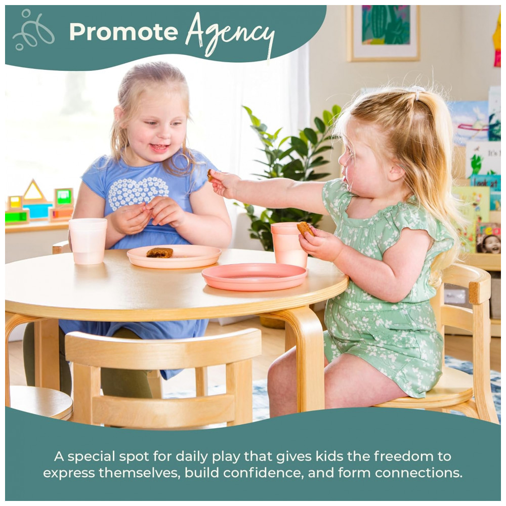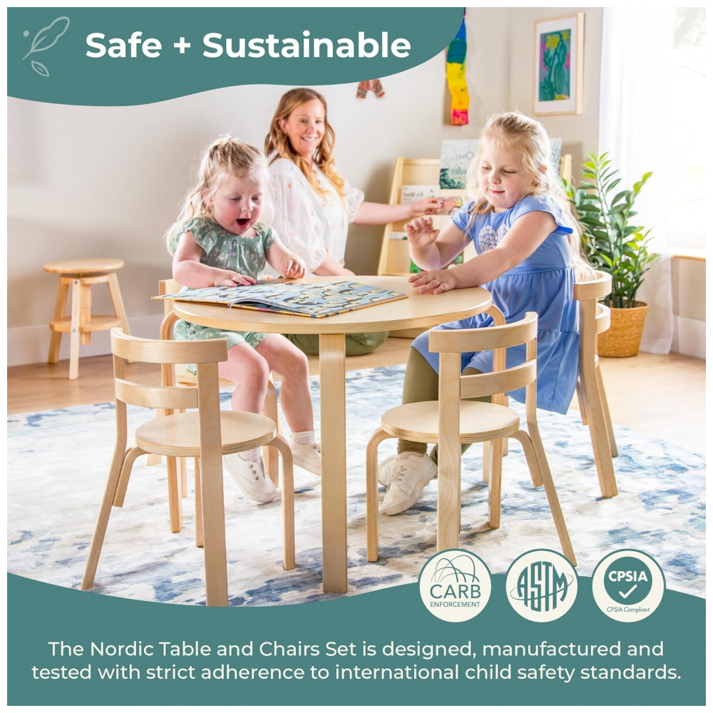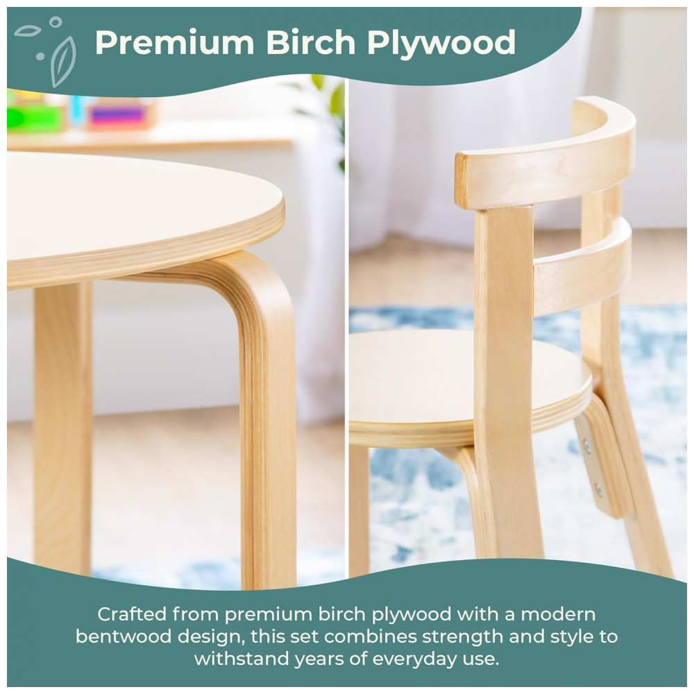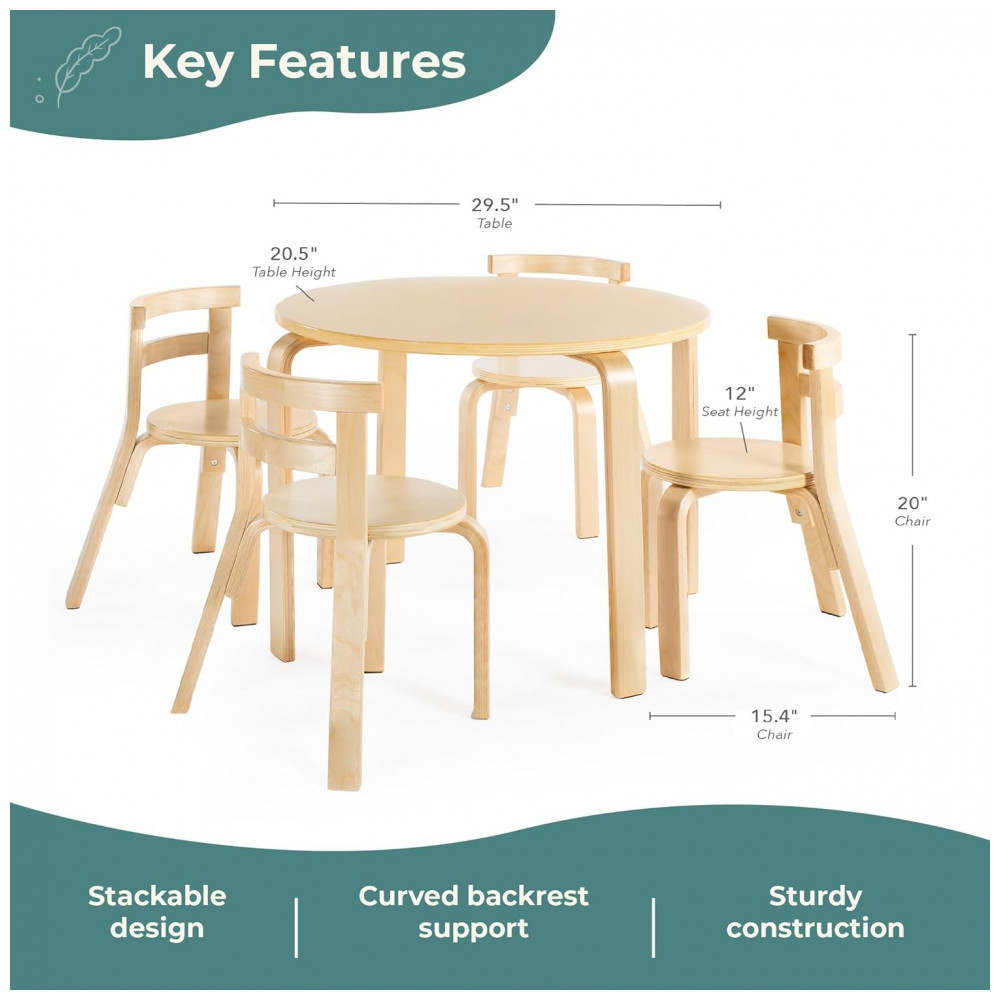 Conjunto infantil de mesa redonda com quatro cadeiras em madeira, indicado para crianças a partir de 2 anos em ambientes como quartos, salas de brincar, escolas, bibliotecas e espaços de homeschooling. A mesa e as cadeiras têm linhas limpas e curvas suaves, com pés em bentwood que oferecem visual moderno e bom aproveitamento do espaço em torno do tampo.
