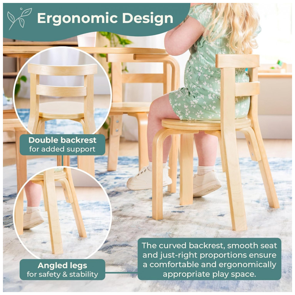 A estrutura é produzida em compensado de bétula, com acabamento protetor de fácil limpeza, adequado para uso diário em atividades de leitura, desenho, artes, jogos, refeições leves e outras propostas de aprendizagem. Cada cadeira possui encosto duplo curvado para suporte extra e é dimensionada para crianças pequenas, permitindo que sentem com os pés apoiados no chão e postura confortável.
