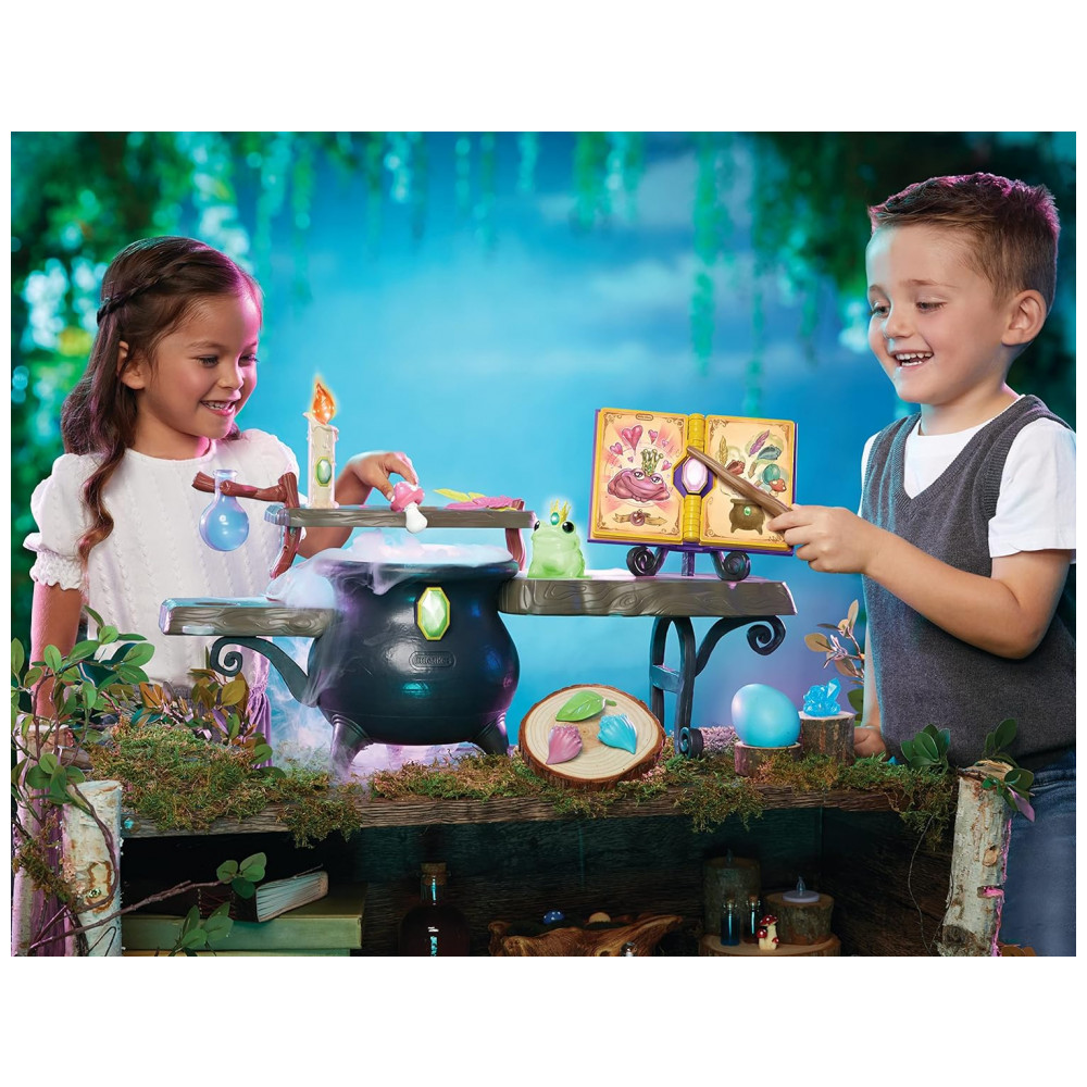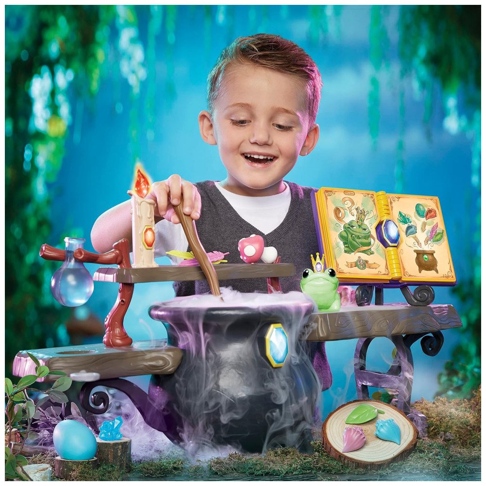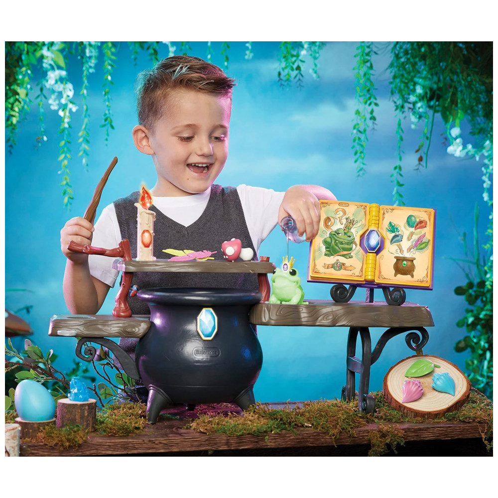 Little Tikes Oficina mágica permite que as crianças entrem em um mundo mágico cheio de poções, feitiços, canto, risos e muito mais. Basta seguir o livro de feitiços fácil de usar e adicionar os ingredientes encantados para misturar a poção perfeita. Suas habilidades de mago permitem que você lance feitiços sem fim com um sapo mágico que se encanta com suas luzes, sons e músicas bobas. O Magic Workshop é onde mágica é divertida e divertida é mágica. Mist adicionada apenas para efeito. O Workshop Mágico não produz névoa real