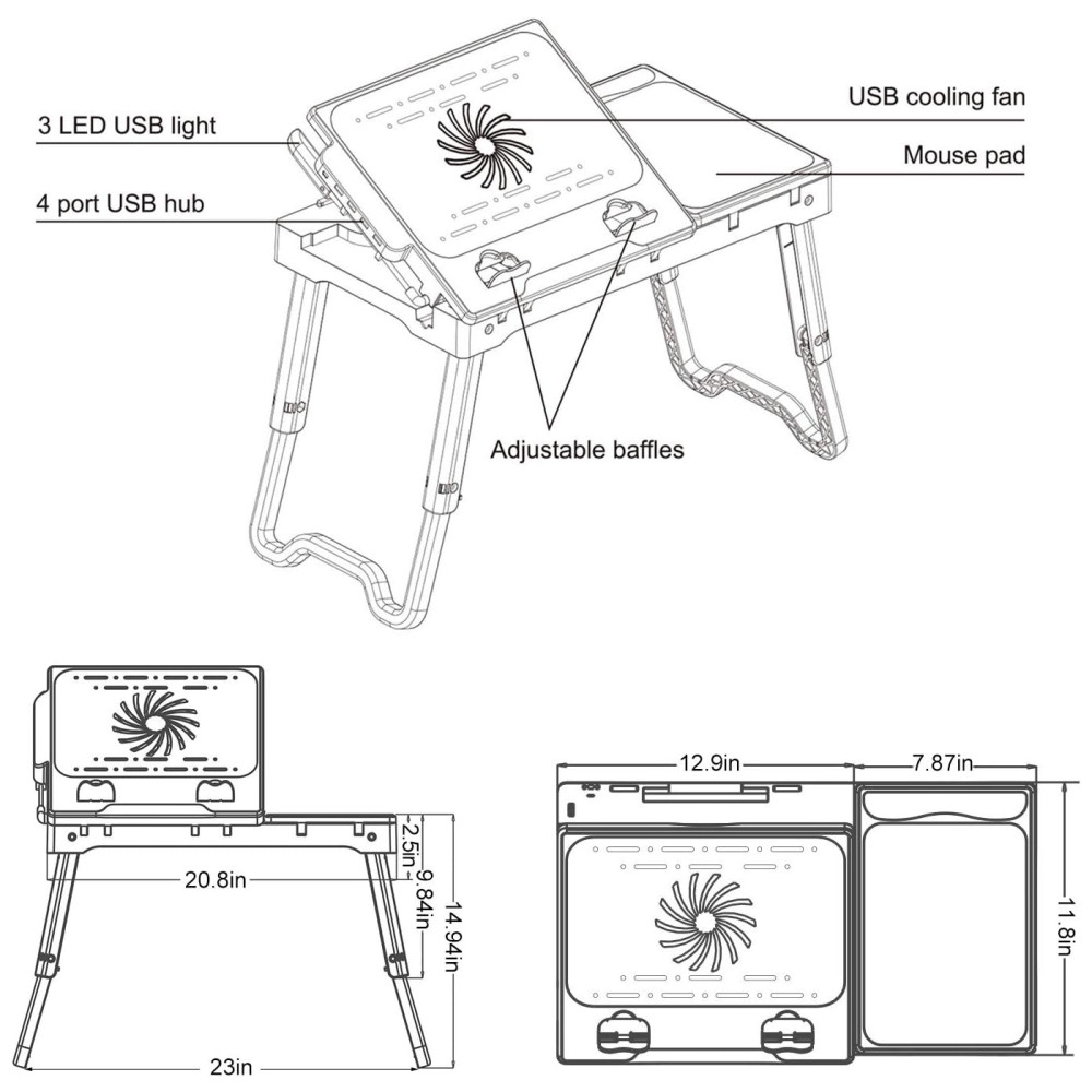 Os compartimentos de zenamento mantêm os itens pequenos em ordem e trazem de volta uma mesa limpa. Tapete de mouse antiderrapante Vem com um grande tapete de mouse com superfície resistente à abrasão, permite que você mova o mouse com precisão e sem cliques escorregadios, além de apoiar seu pulso para reduzir o esforço da mão devido ao longo tempo de trabalho. Ventilador de resfriamento atencioso Conecte o cabo de carregamento incluído, nosso ventilador perfurado embutido começará a funcionar, resfriando a dissipação de calor liberada pelo seu laptop. Prolongue a vida útil de seu precioso laptop e de nossa mesa