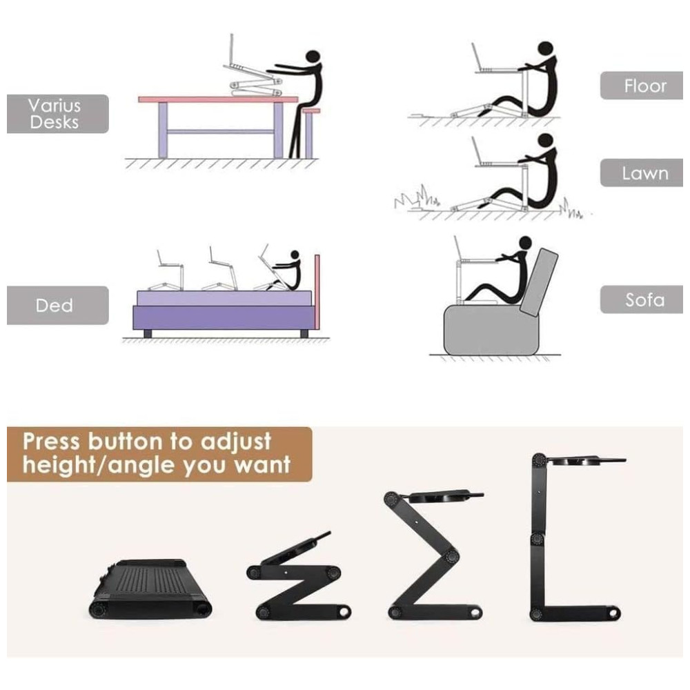 Material leve e robusto O suporte para laptop dobrável portátil adota uma bandeja de alumínio leve e de alta intensidade com 2 pernas antiderrapantes e 6 articulações ABS ajustáveis e robustas de travamento automático. O suporte pode conter seu computador ou livro com segurança em qualquer ângulo. Esta mesa única e elegante é elegante e moderna.