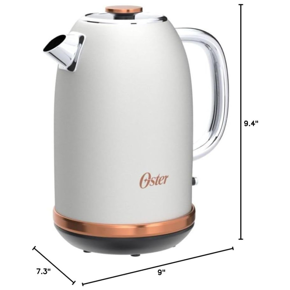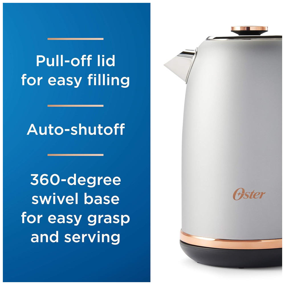 Esta chaleira elétrica Oster da coleção metropolitana elegante irá aprimorar qualquer decoração de cozinha com seus elegantes detalhes em ouro rosa
