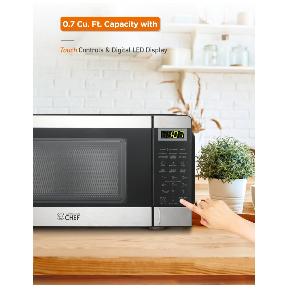 6 configurações convenientes de cozimento rápido incluem pipoca, batata assada, pizza, bebida, reaquecer e jantares congelados.