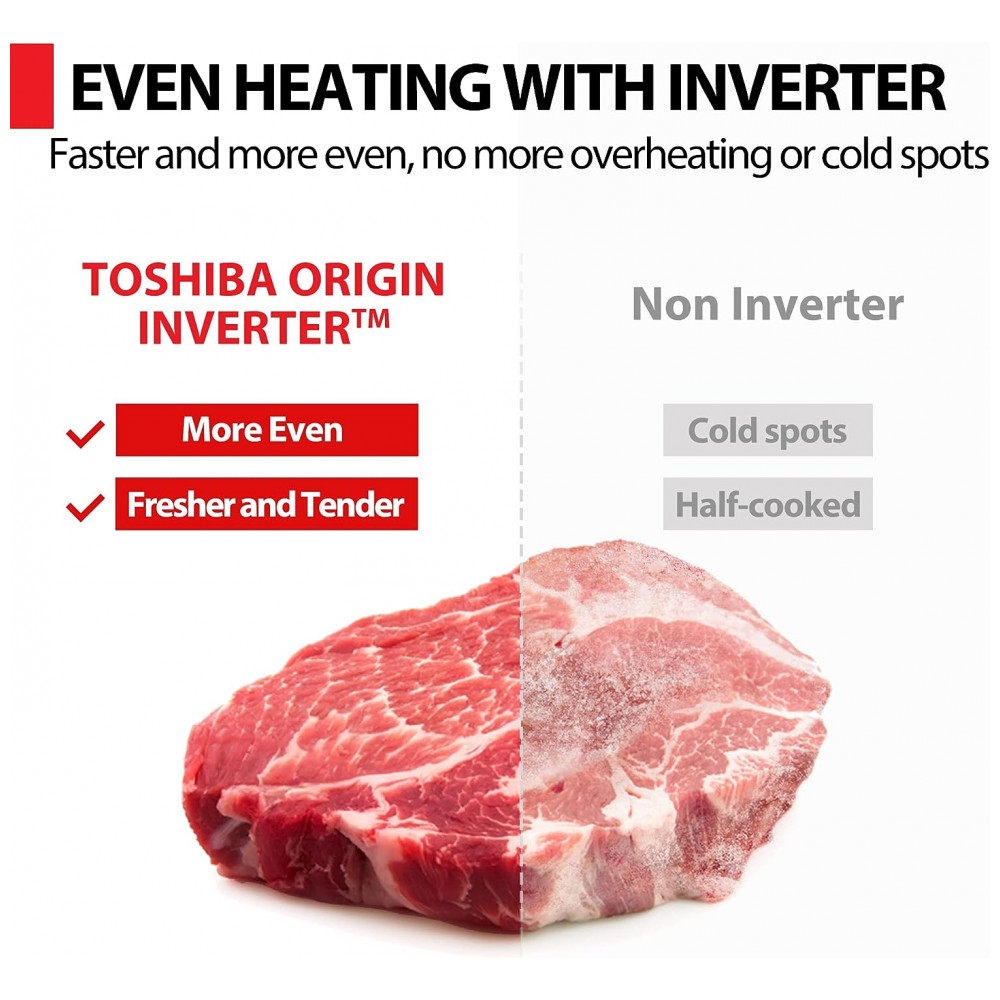 Tecnologia Inverter para Cozinhar e Descongelar Igualmente A Tecnologia TOSHIBA ORIGIN Inverter permite uma distribuição mais uniforme do calor na cavidade, proporciona uma cozedura uniforme, reaquece e descongela, garantindo a máxima textura tenra. Além disso, o nível de ruído de trabalho de 50dB oferece a você e sua família um ambiente de cozimento tranquilo e imperturbável.