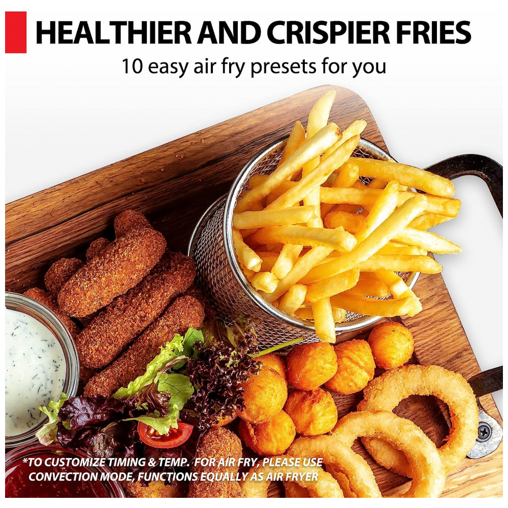 Menos gordura e crocante O micro ondas de convecção TOSHIBA com circulação de calor de 360 reduz as calorias ao não usar óleo adicionado, ao mesmo tempo em que oferece alimentos fritos mais crocantes e dourados, como nuggets de frango, peixe frito e batatas fritas. A assadeira fornecida e as duas grades são usadas para obter ótimos resultados de fritura. NOTA Use o modo de convecção se precisar personalizar o tempo e a temperatura, funciona igualmente como fritadeira.
