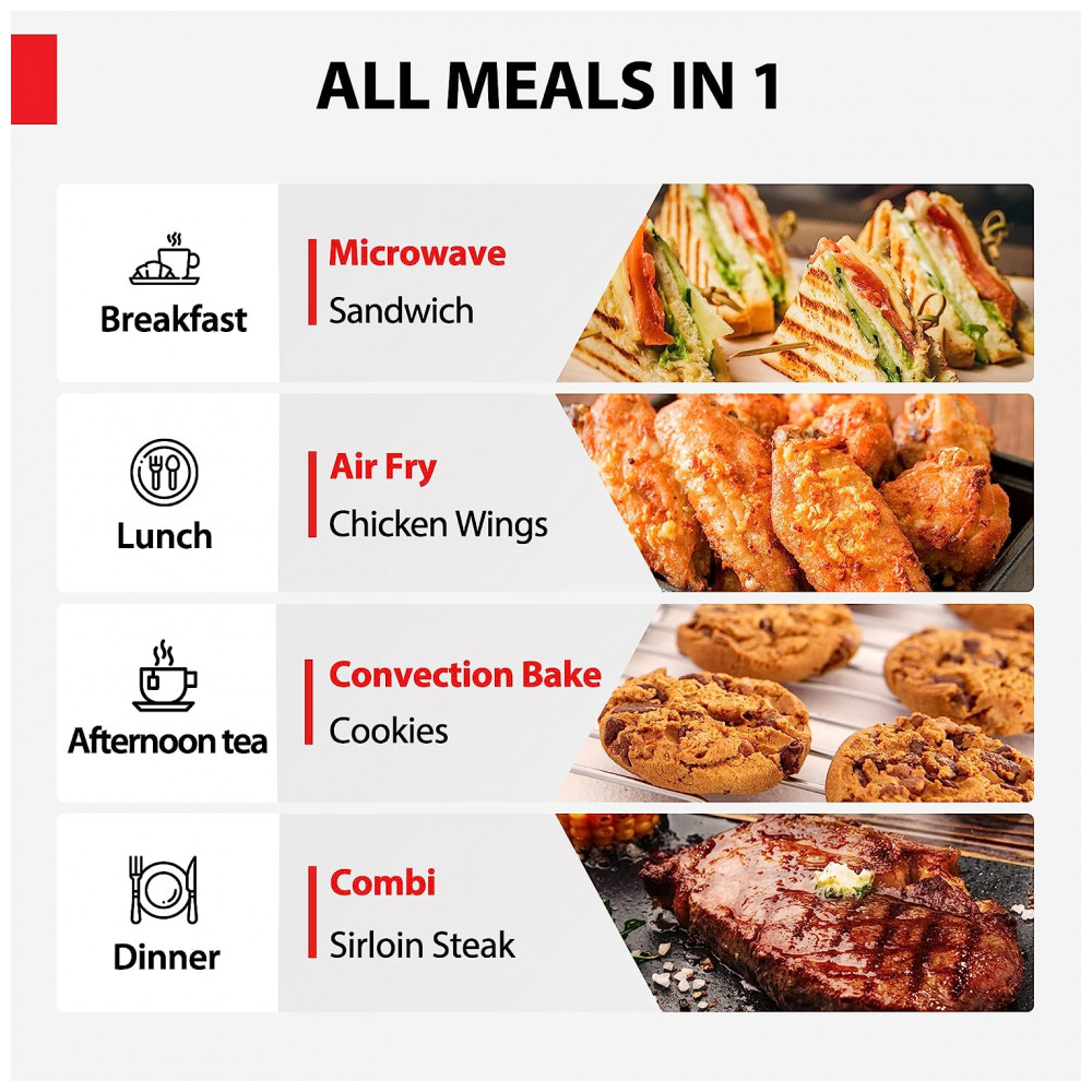 Acelere o cozimento com modos combinadosApesar da potência de saída de 1800 W e 1000 W sob grelhador, os modos combinados aceleram seu cozimento com a combinação de micro ondas, convecção e função grill, enquanto oferecem pratos perfeitos com crocante, exterior dourado e interior de textura tenra.