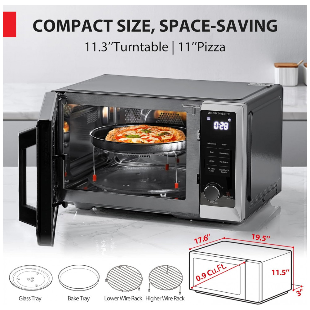 Descubra receitas incríveis Vem com um livro de receitas com 27 receitas clássicas. Além disso, o próprio micro ondas possui 11 menus automáticos, 10 menus Air Fry e 6 predefinições de descongelamento, para que os novatos também possam fazer refeições com estrelas Michelin em casa. Dimensão externa 48 de largura x 43 de profundidade x 27 centimetros de altura com plataforma giratória de 27 centimetros