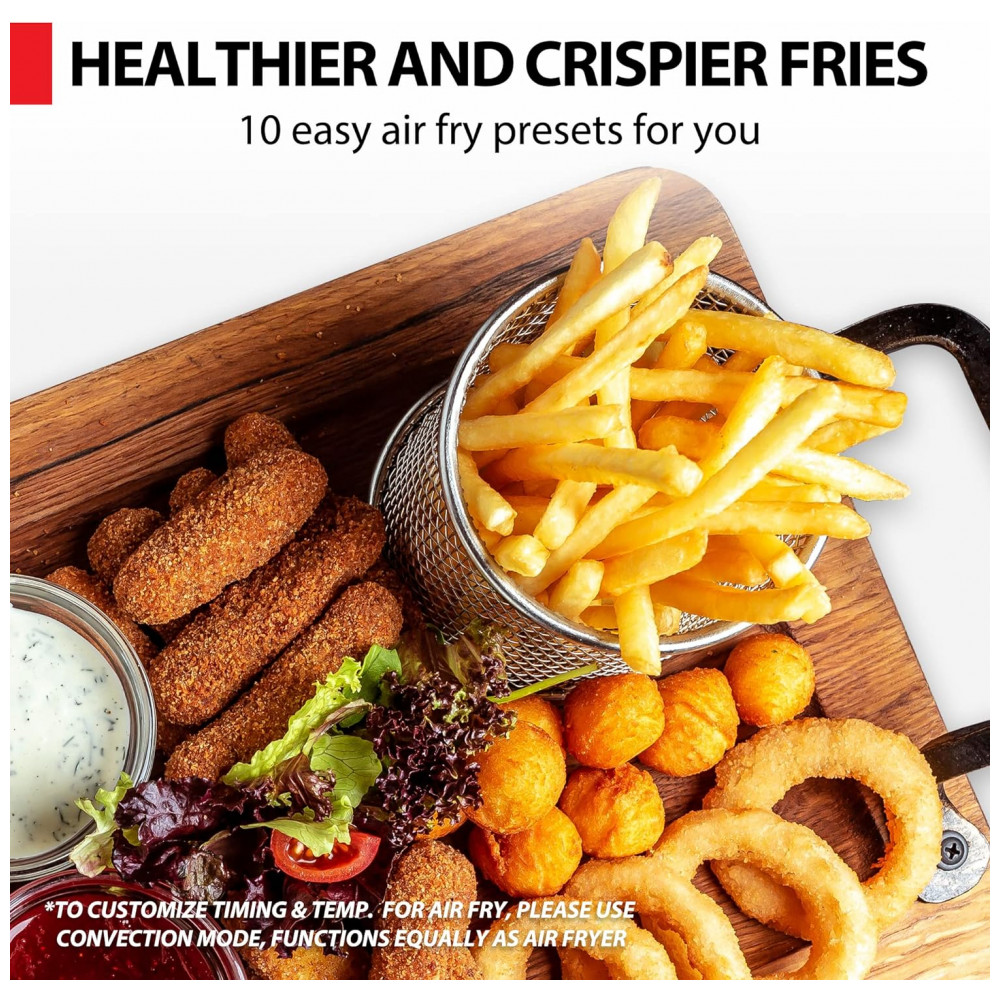 Menos gordura e crocante O micro ondas de convecção TOSHIBA com circulação de calor de 360 reduz as calorias ao não usar óleo adicionado, ao mesmo tempo em que oferece alimentos fritos mais crocantes e dourados, como nuggets de frango, peixe frito e batatas fritas. A assadeira fornecida e as duas grades são usadas para obter ótimos resultados de fritura. NOTA SE NECESSÁRIO PERSONALIZAR O TEMPO E A TEMPERATURA PARA O AIR FRY, USE O MODO DE CONVECÇÃO, FUNCIONA IGUALMENTE AO AIR FRYER.