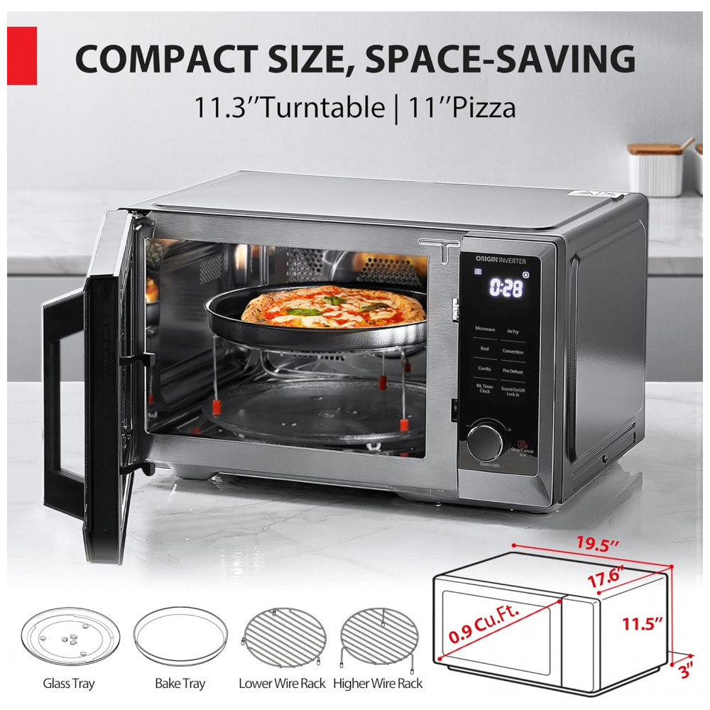 Descubra receitas incríveis Vem com um livro de receitas com 27 receitas clássicas. Além disso, o próprio micro ondas possui 11 menus automáticos, 10 menus Air Fry e 6 predefinições de descongelamento, para que os novatos também possam fazer refeições com estrelas Michelin em casa. Dimensão externa 48 de largura x 43 de profundidade x 27 centimetros de altura com plataforma giratória de 27 centimetros folga 2 centimetros na parte traseira e 7 centimetros de cada lado e superior pelo menos