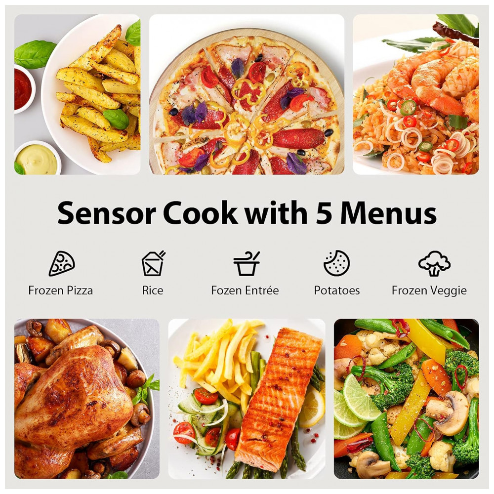 Menu de sensor pré programado para aquecimento ideal de alimentos populares como pizza, batatas, vegetais e muito mais Potência de Potência Microondas 1100W Tensão nominal 120V 60Hz.