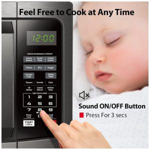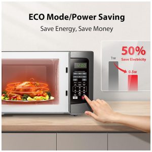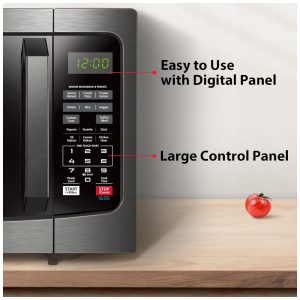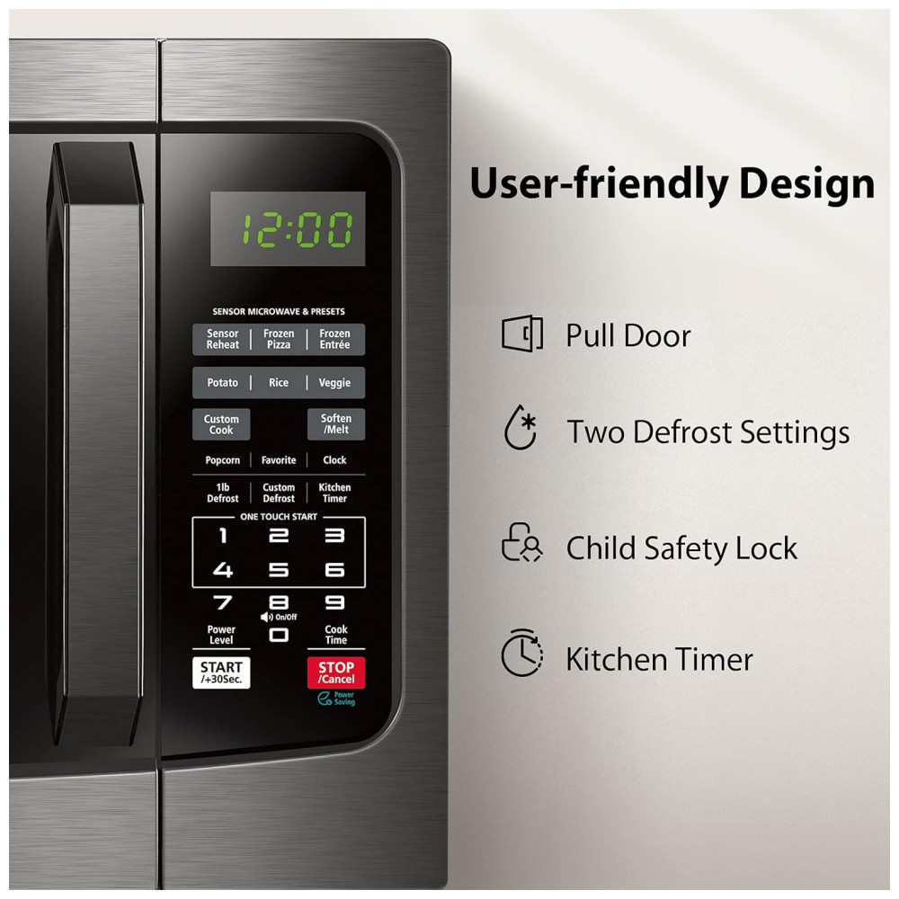 Outras funções 1100 watts com 10 configurações de energia, descongelamento por tempo e peso, relógio e timer de cozinha, início com um toque para várias predefinições de alimentos.