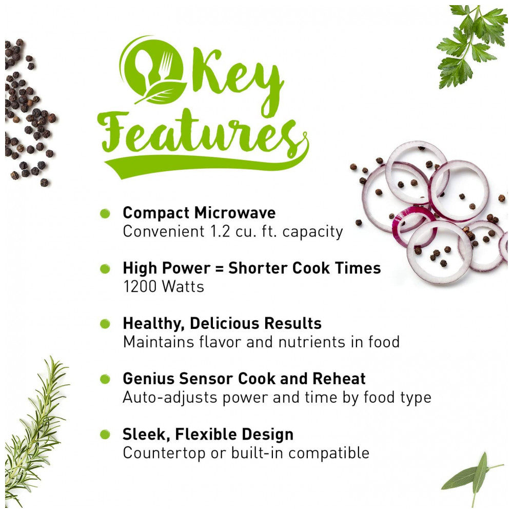 Configurações inteligentes de cozimento com sensor Genius O sensor automático automático integrado ajusta a potência e os tempos com base em diferentes alimentos Outras vantagens incluem 14 itens de menu predefinidos, timer de minutos rápido, início retardado e trava de segurança para crianças.