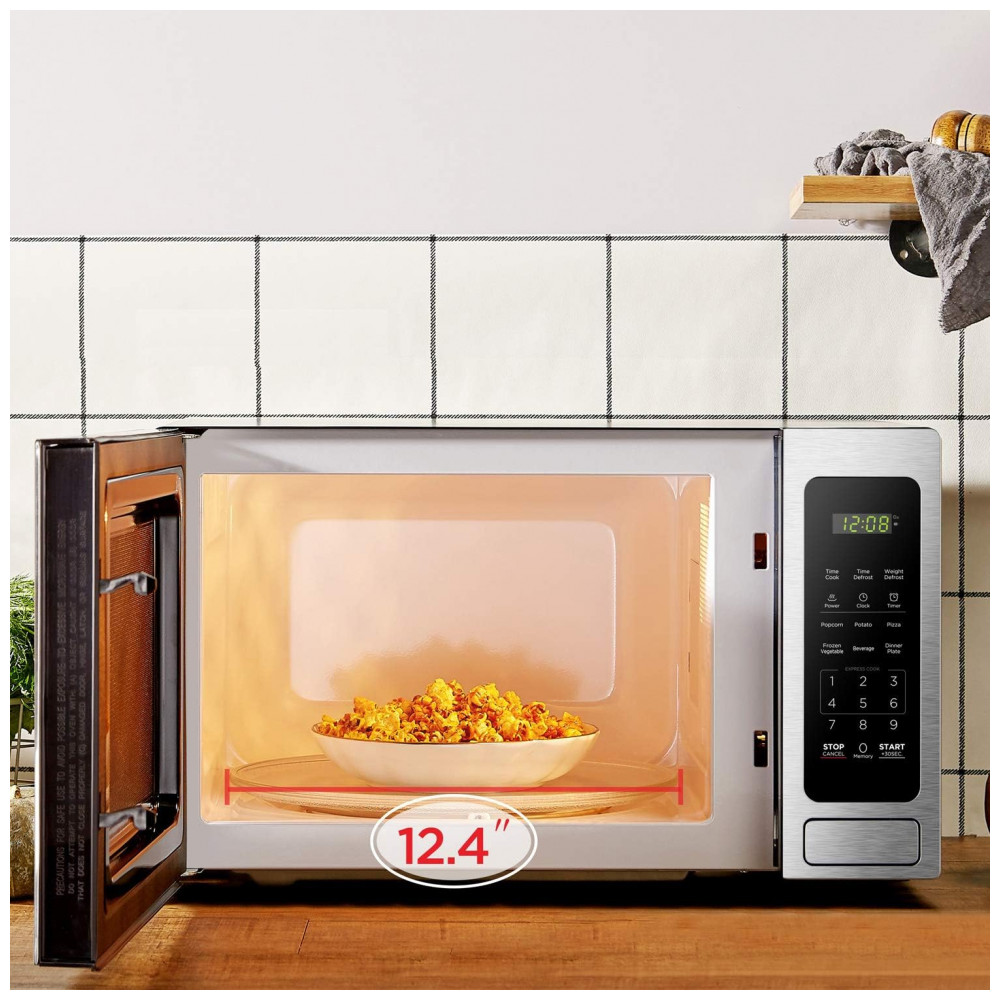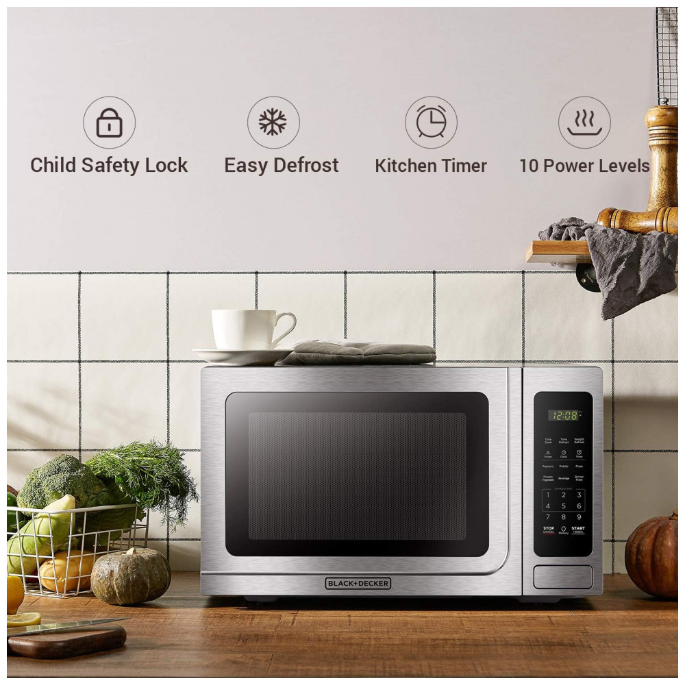 1000 Watts com 10 configurações de energia, relógio e timer de cozinha, 30 Seconds Express Cooking.