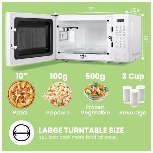 Função mudo, configurações, relógio, timer de cozinha, trava de segurança para crianças, funções fáceis de cozimento automático pipoca, batata, pizza, vegetais congelados, bebidas, reaquecer.
