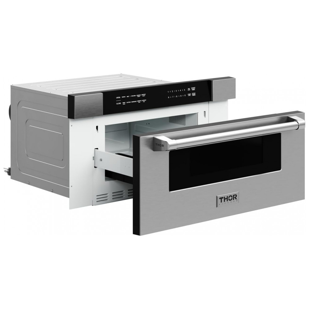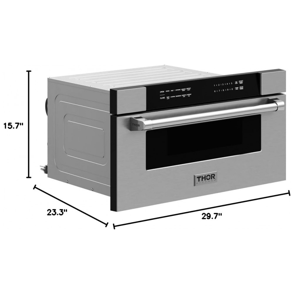 Micro-ondas de embutir gaveta 76 cm Thor Kitchen inox 34L 10 níveis de potência 8 modos de cozimento 1000W 110V