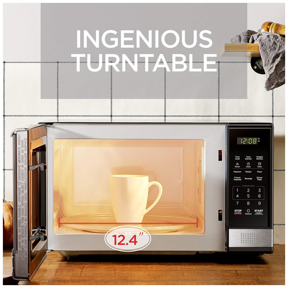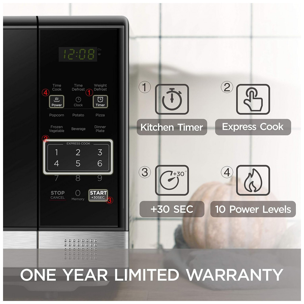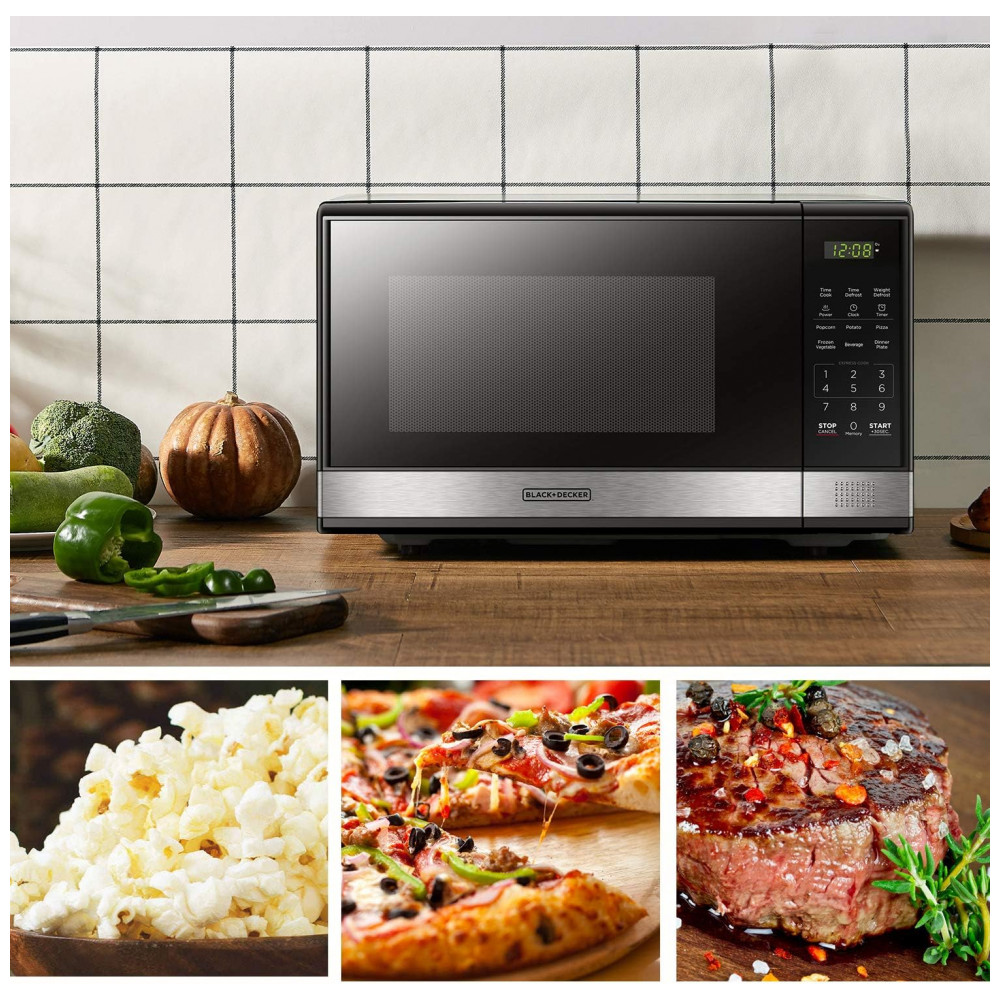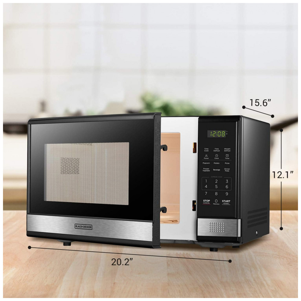 Aprimore sua cozinha com o micro-ondas profissional BLACK+DECKER de aço inoxidável preto de 31 litros e 1000 watts. Com 10 níveis de potência, prato giratório de vidro removível e amplo interior, este micro-ondas proporciona aquecimento e descongelamento uniformes para resultados excelentes. Cozinhe ou reaqueça seis alimentos populares com o toque de um botão. Escolha entre níveis de potência de até 1000 watts. O display digital de LED grande conta com função de relógio e timer regressivo, além de mostrar o tempo restante de cozimento. Com trava de segurança para crianças, luz interna, função de timer de cozinha, este micro-ondas de bancada de 1000 watts possui interface fácil de usar. Pré-programado para pipoca, batata, pizza, vegetais congelados, bebidas e prato de jantar. Frequência de 60 Hz, potência de 1000 watts com 10 configurações de potência, timer de cozinha, cozimento expresso de 30 segundos, potência de entrada de 1600W. Design elegante com porta de aço inoxidável preto. Dimensões de 52,8cm x 41,9cm x 30,7cm.