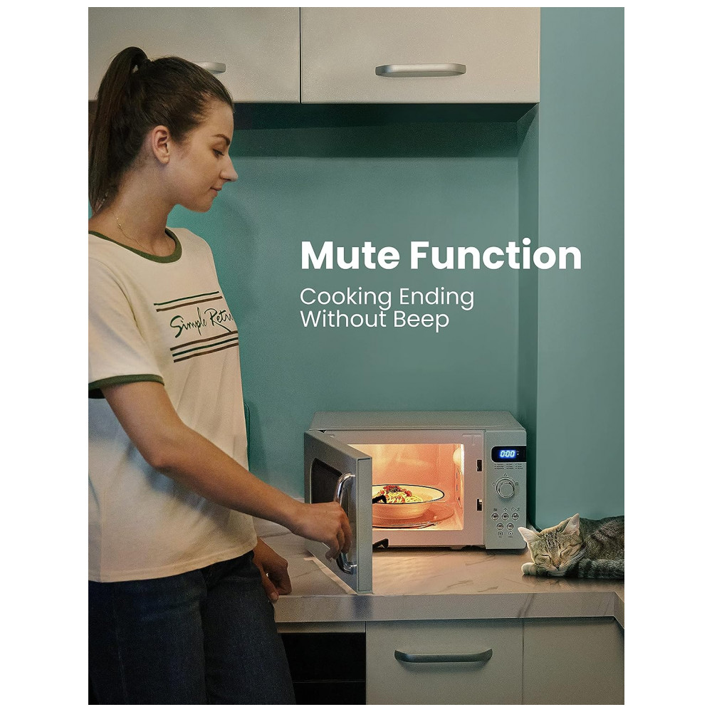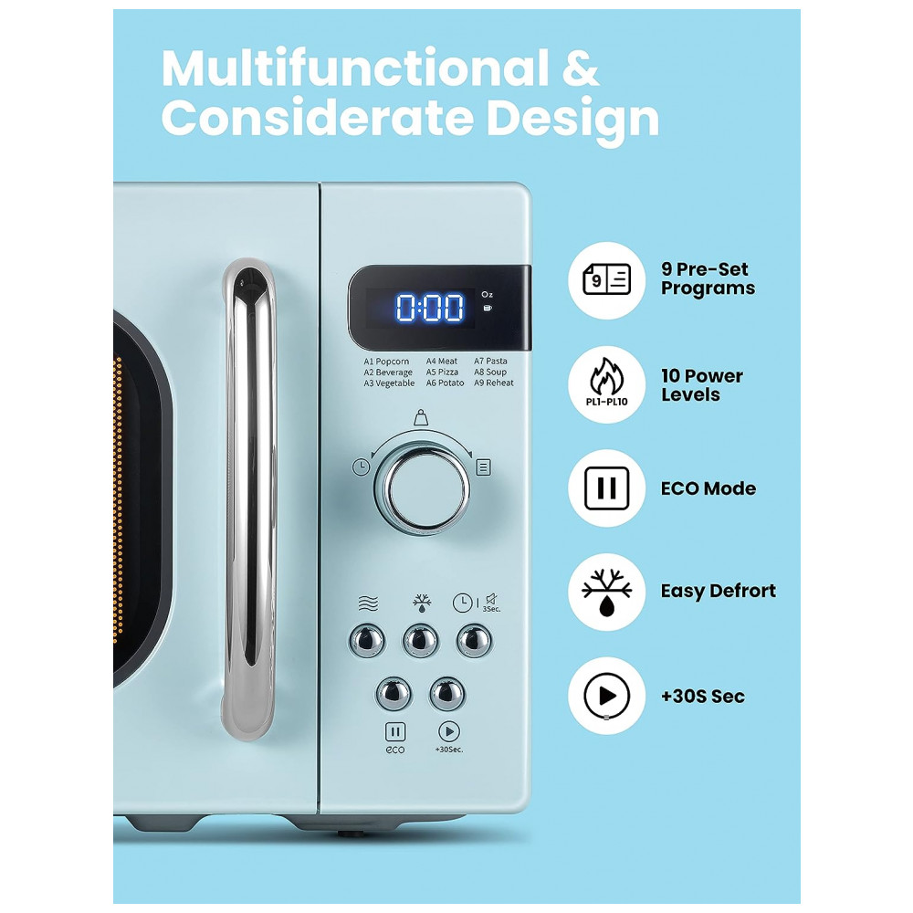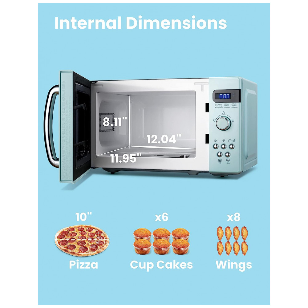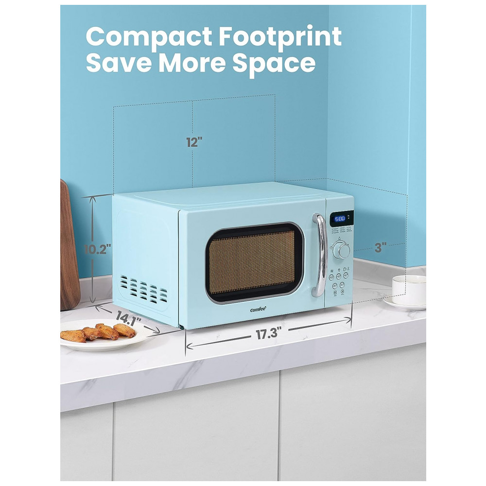 TAMANHO COMPACTO Com 700 Watts, este pequeno micro ondas retrô é poderoso, mas também tem uma pegada muito pequena para economizar espaço. Ele pode caber em uma plataforma giratória de 10 polegadas com seu tamanho compacto