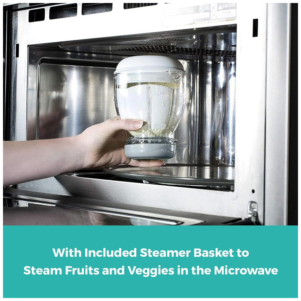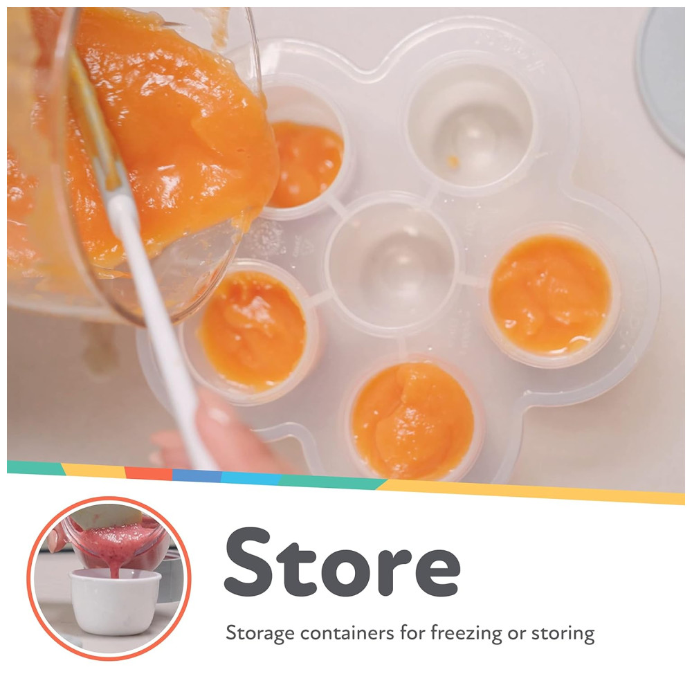 Inclui Acessórios para Preparação, Armazenamento e Alimentação: Inclui tampa de duas peças, cesto de cozimento a vapor seguro para micro-ondas, tigela para lotes, base de energia, lâminas do liquidificador, tampas herméticas, copo curto, espátula, copos de armazenamento de alimentos, bandeja para freezer, colheres de alimentação e livro de receitas para bebês.