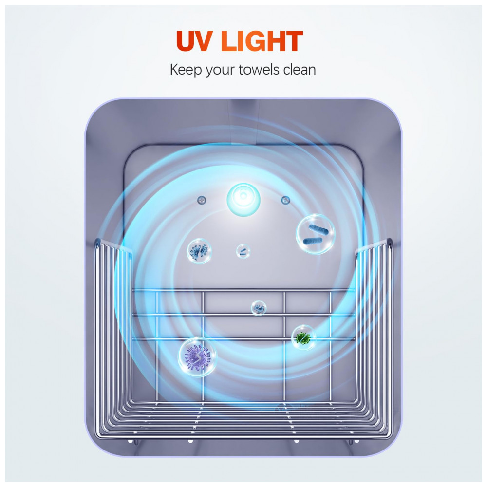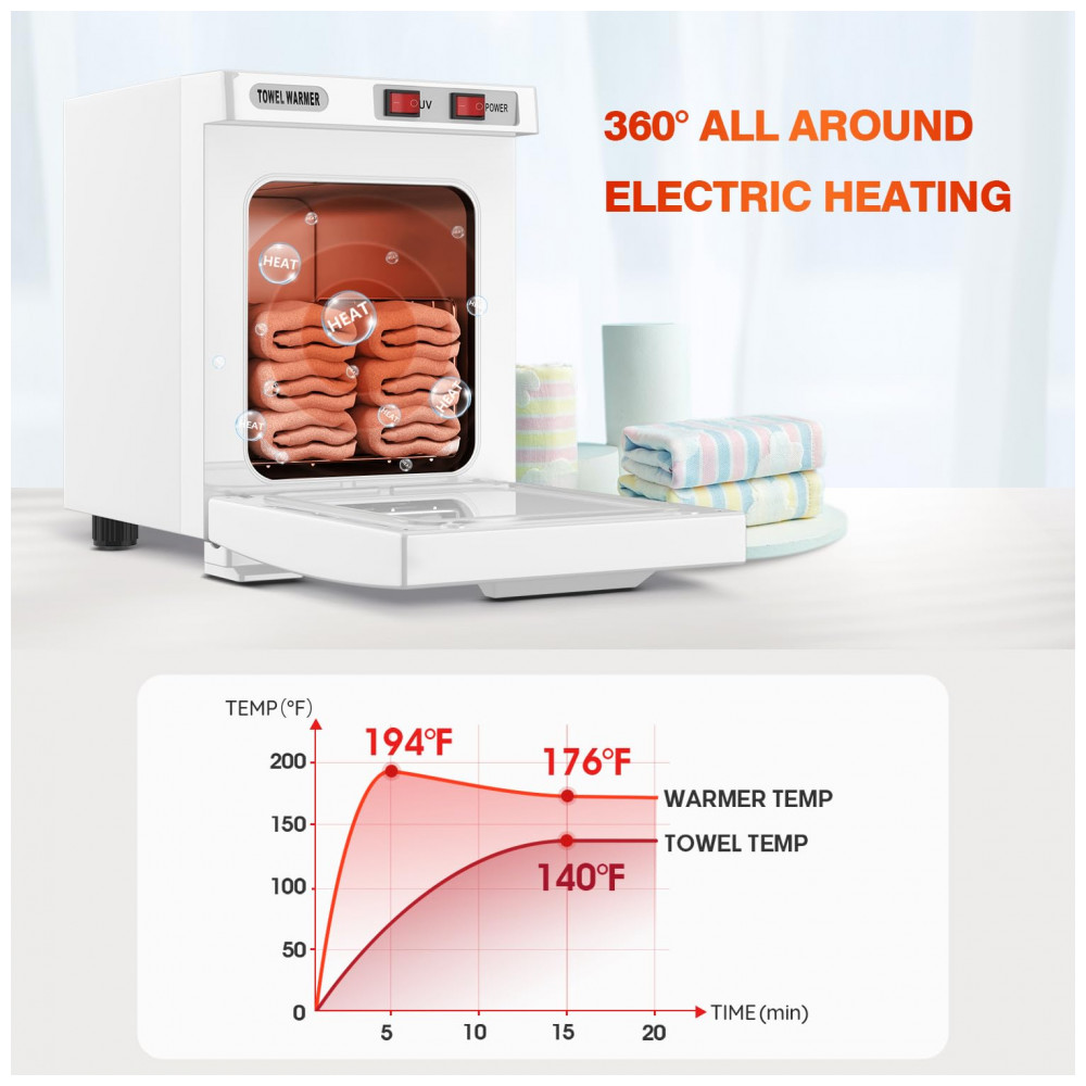 Nosso aquecedor de toalhas é feito com materiais de alta qualidade e conta com um design interno moderno em alumínio. Ele utiliza elementos de aquecimento avançados para esquentar suas toalhas de forma rápida e eficiente, alcançando até 80°C (176°F). Com dimensões internas de 15,70 cm x 17,70 cm x 17,78 cm, ele pode acomodar até 6 toalhas de tamanho padrão, sendo compacto e economizando espaço em comparação com modelos maiores.