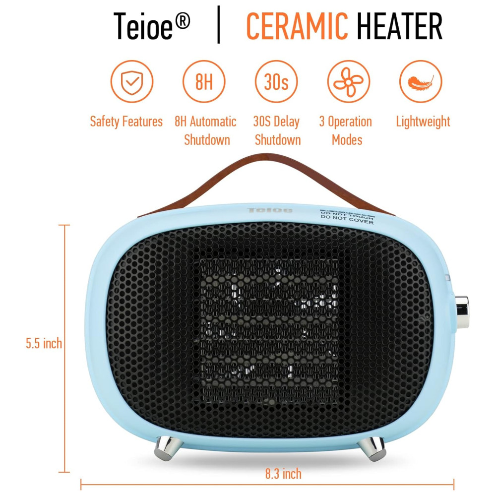 Descubra o Aquecedor de Espaço Teioe Mini Elétrico 800W/400W, Pequeno Aquecedor de Cerâmica PTC com Proteção contra Tombamento e Sobreaquecimento, 3 Modos de Operação, Aquecedores de Espaço para Ambientes Internos, Escritório, Quarto (Azul Céu)