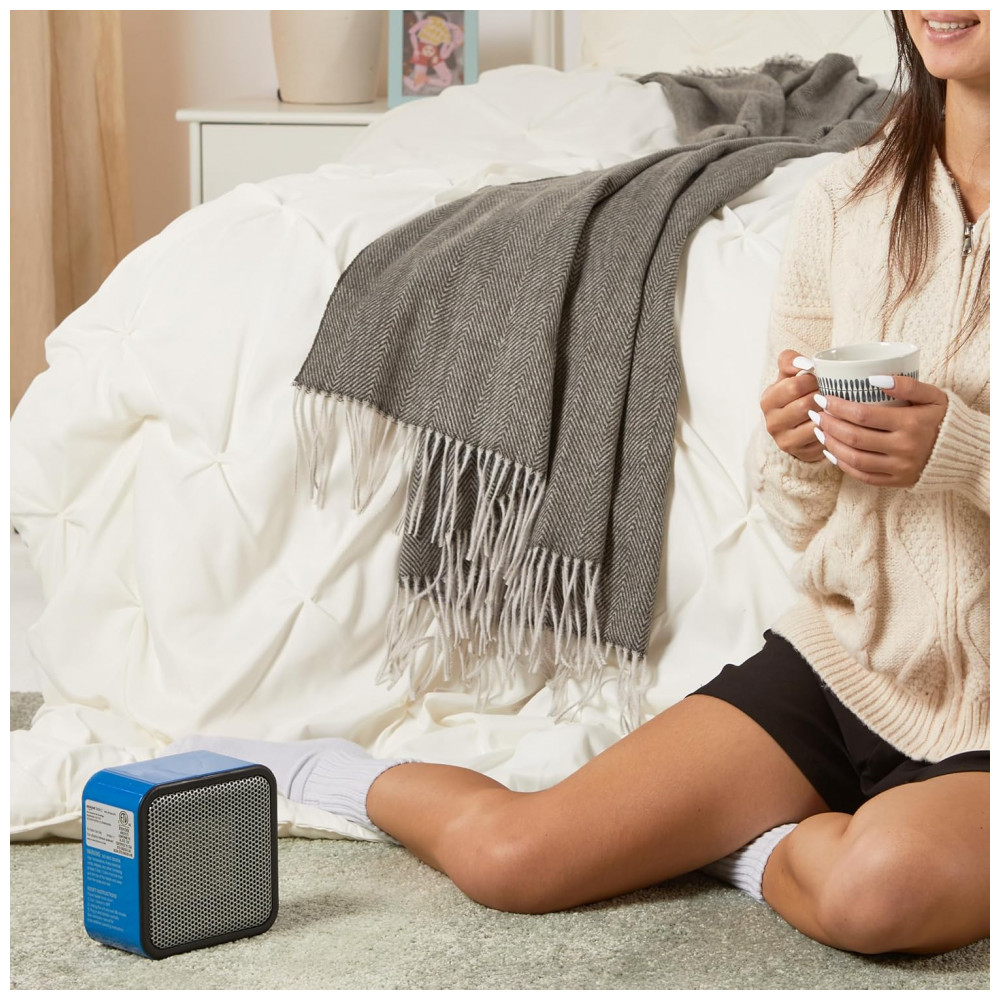 Compacto e Eficiente – Este aquecedor pessoal em azul é ideal para mesas ou escrivaninhas, proporcionando aquecimento rápido e eficaz.