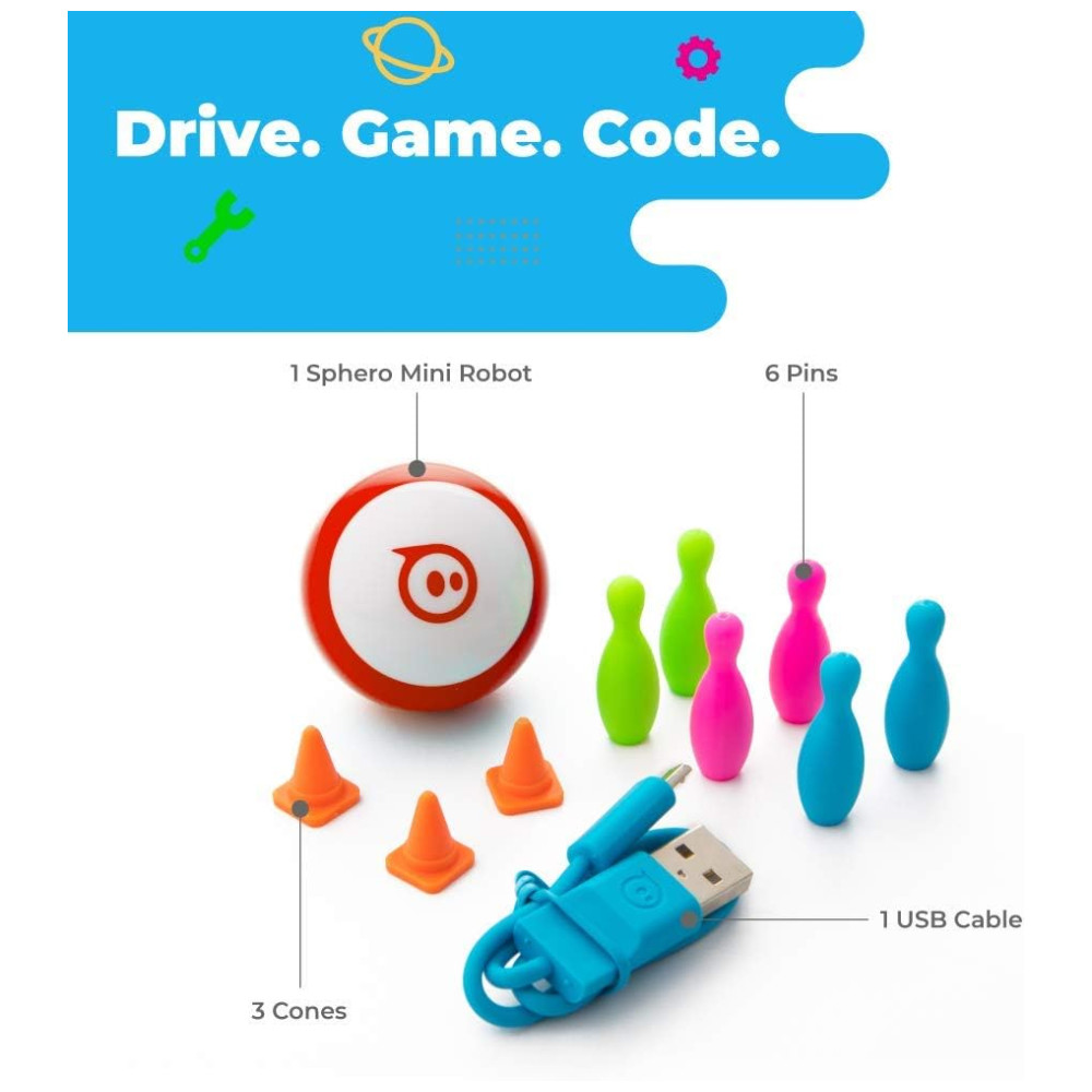 Conteúdo da embalagem: Robô Sphero Mini, cabo micro-USB para recarga, 3 cones, 6 pinos de boliche