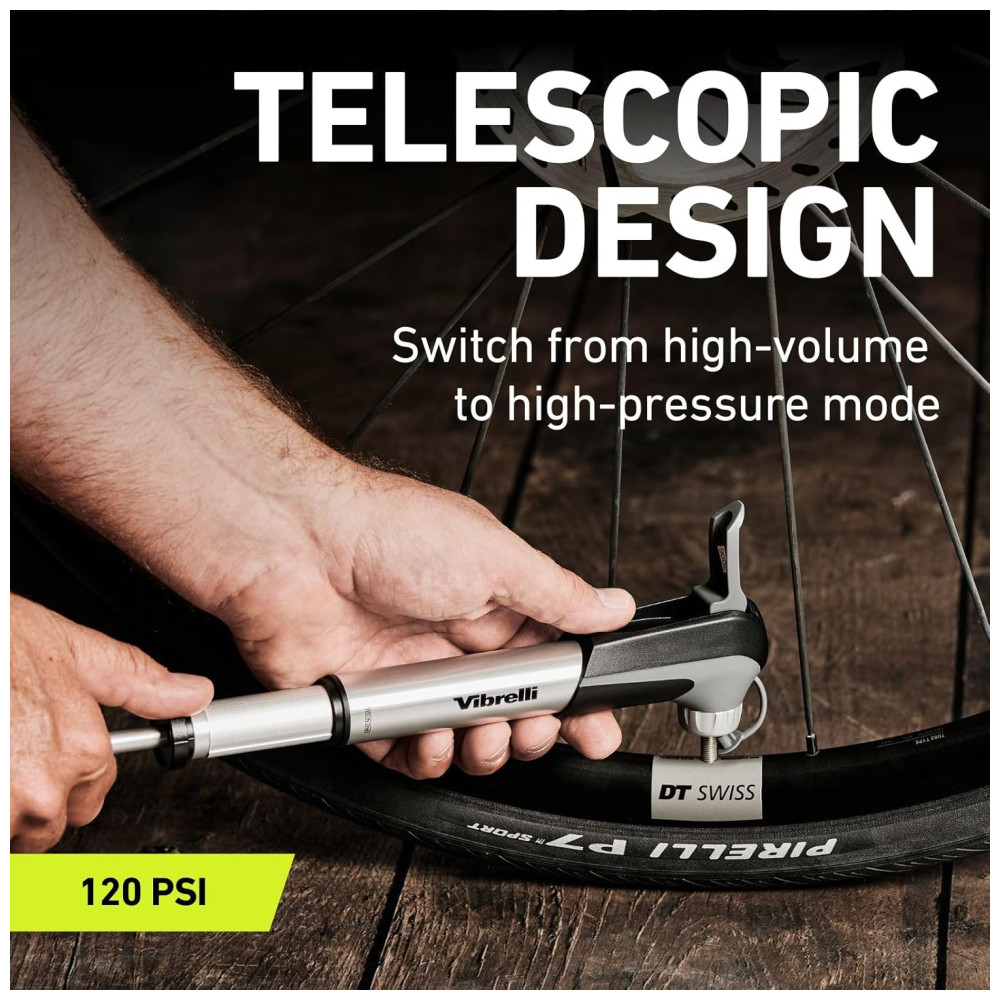 Design de telescópio extensível de 120 PSI Mude de inflação de alto volume para inflação de alta pressão. Bomba de mini bicicleta perfeita para bicicletas de estrada e MTBs.