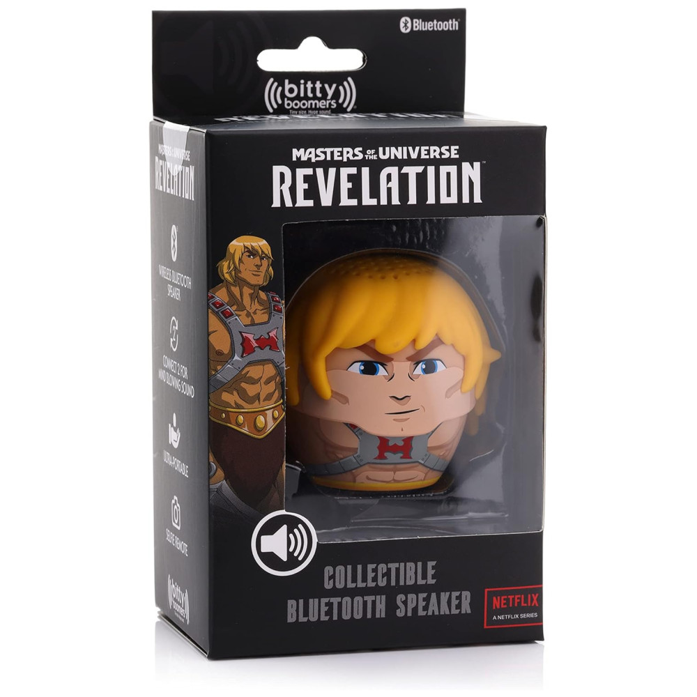 Mini Caixa de Som Bluetooth Mestres do Universo Revelação He Man Bitty Boomers com Design Multicolorido.