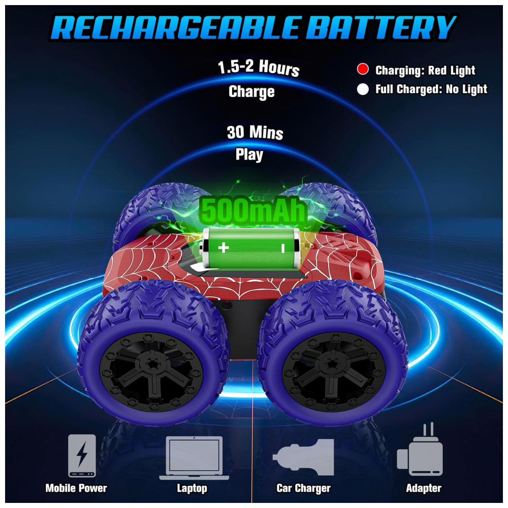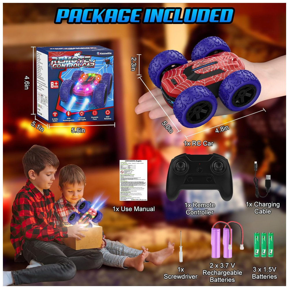O Carrinho de Controle Remoto Kazswitle é único, com design exclusivo, luzes LED coloridas embutidas, capacidade de acrobacias de 360 graus em dupla face e potência 4WD, proporcionando uma experiência de direção emocionante e envolvente para crianças. Com a capacidade 4WD, esse carro RC pode conquistar qualquer terreno. Possui 4 modos de luzes deslumbrantes, permitindo que as crianças personalizem as cores. Equipado com duas baterias recarregáveis de 500mAh, o carro de acrobacias pode ser carregado em 1,5 a 2 horas e oferece 30 minutos de autonomia. O controle remoto de 2.4GHz permite controlar vários carros simultaneamente a uma distância de 35 metros. Feito de plástico ABS e borracha, o carro não se quebra após múltiplas colisões. Um presente perfeito para crianças de 4 a 12 anos, este pacote inclui o carro RC, controle remoto, baterias recarregáveis, pilhas, cabo de carregamento, chave de fenda e manual de instruções.