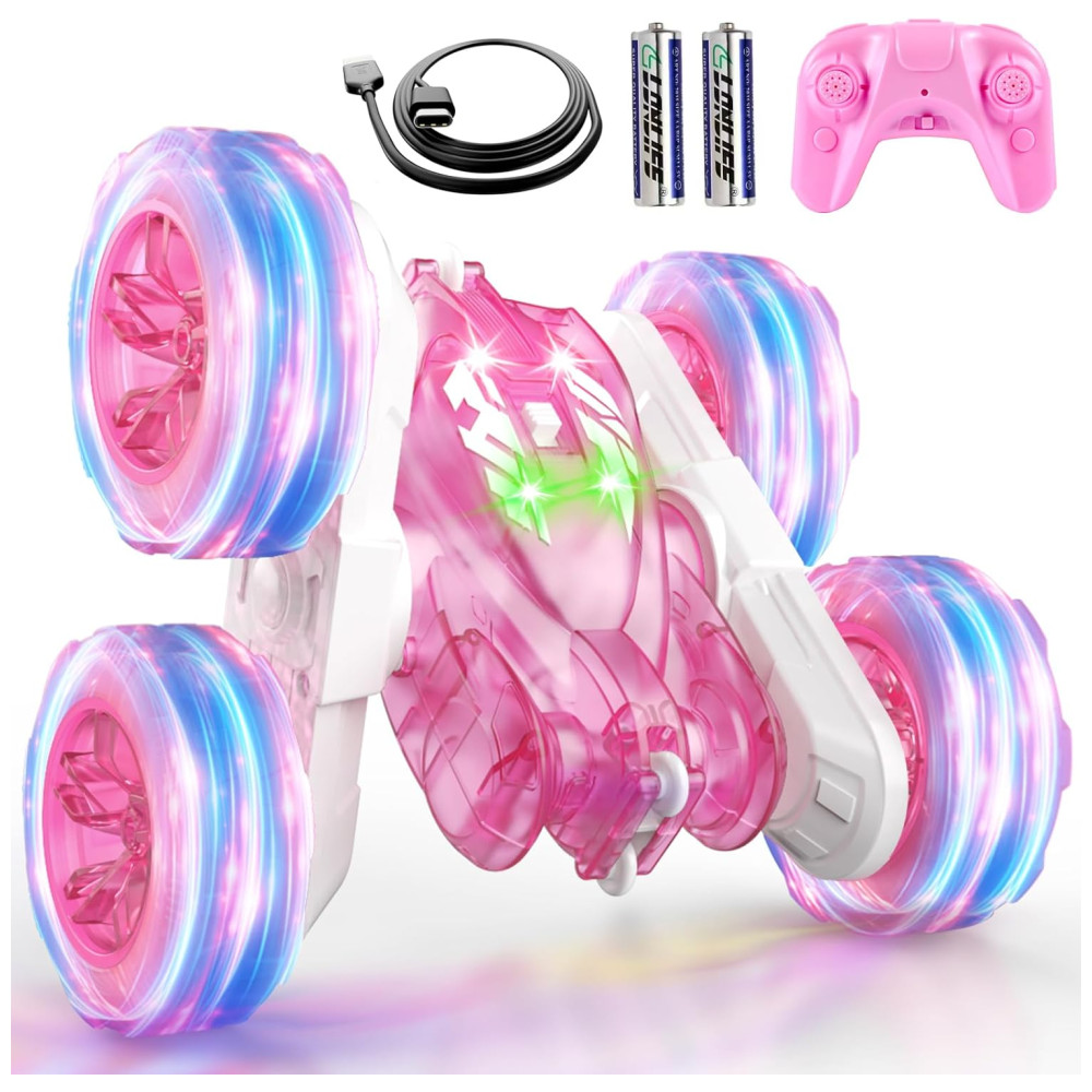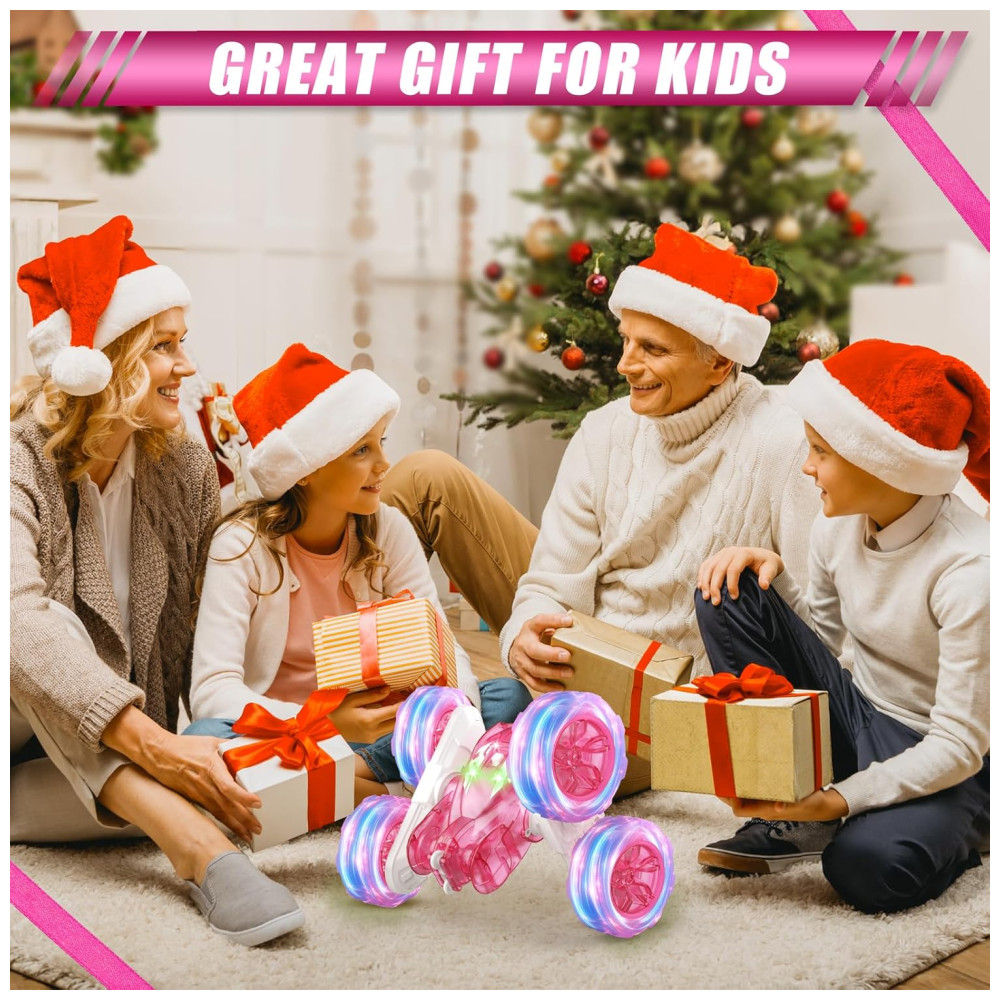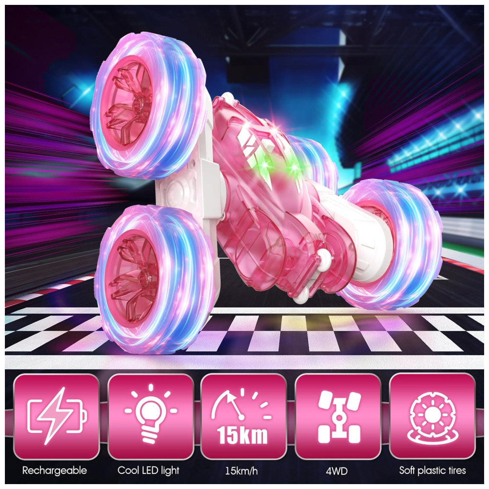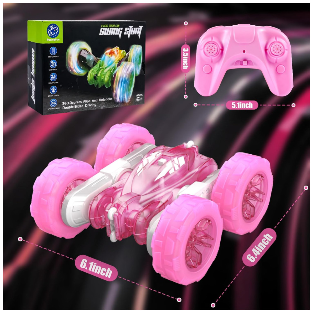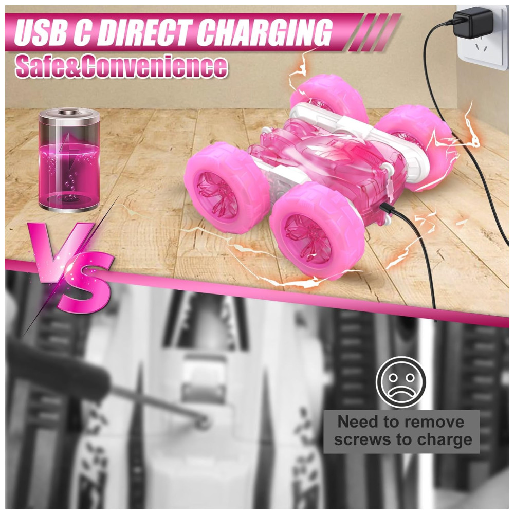 O Carrinho de Controle Remoto Rosa para Meninas da RacingFun foi atualizado com carregamento rápido direto via USB-C, eliminando a necessidade de cabos extras. Com luzes coloridas, o carro suporta corridas de dia e de noite, além de movimentos para frente, para trás, giros de 360 graus e flips de 180 graus, proporcionando uma experiência de condução incrível. Equipado com motor potente, tração nas quatro rodas e pneus anti deslizantes, este carro off-road é ideal para competições em qualquer terreno. Fácil de controlar, emocionante para as crianças, e capaz de realizar diversas acrobacias, é o presente perfeito para meninas de 6 a 12 anos.