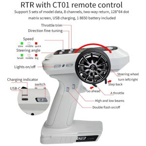 Este é um carro rastreador de mesa altamente flexível, capaz de escalar todos os tipos de terrenos complexos. Com um design requintado e aparência realista, este dispositivo permite que você controle como se estivesse dirigindo um carro de verdade. A bateria integrada Lipo de 230mAh oferece até 80 minutos de duração. O transmissor de controle remoto CT01 de 8 canais oferece monitoramento em tempo real da intensidade do sinal, bem como exibição de tensão e alarme de baixa tensão. O veículo possui faróis dianteiros e traseiros piscando rapidamente para indicar o status de baixa tensão da bateria e garantir a segurança. O design de detalhes precisos inclui iluminação simulada de feixes altos, sinais de mudança de direção, luzes de freio, luzes piscantes duplas, spray de tinta simulado, caixa de velocidades, rodas e engrenagens de metal.