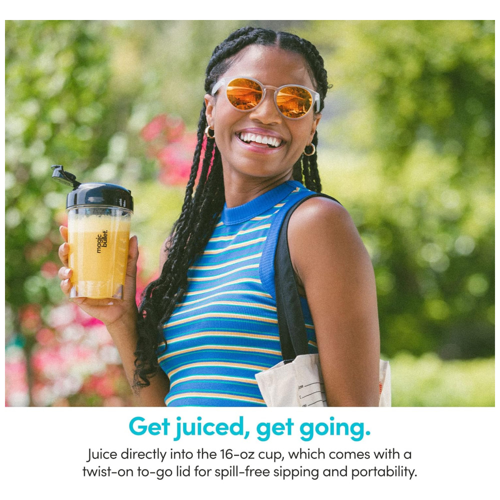 Suco diretamente em nosso copo de 473 mL, que vem com uma tampa de torção para uso para beber e portabilidade sem derramamento.