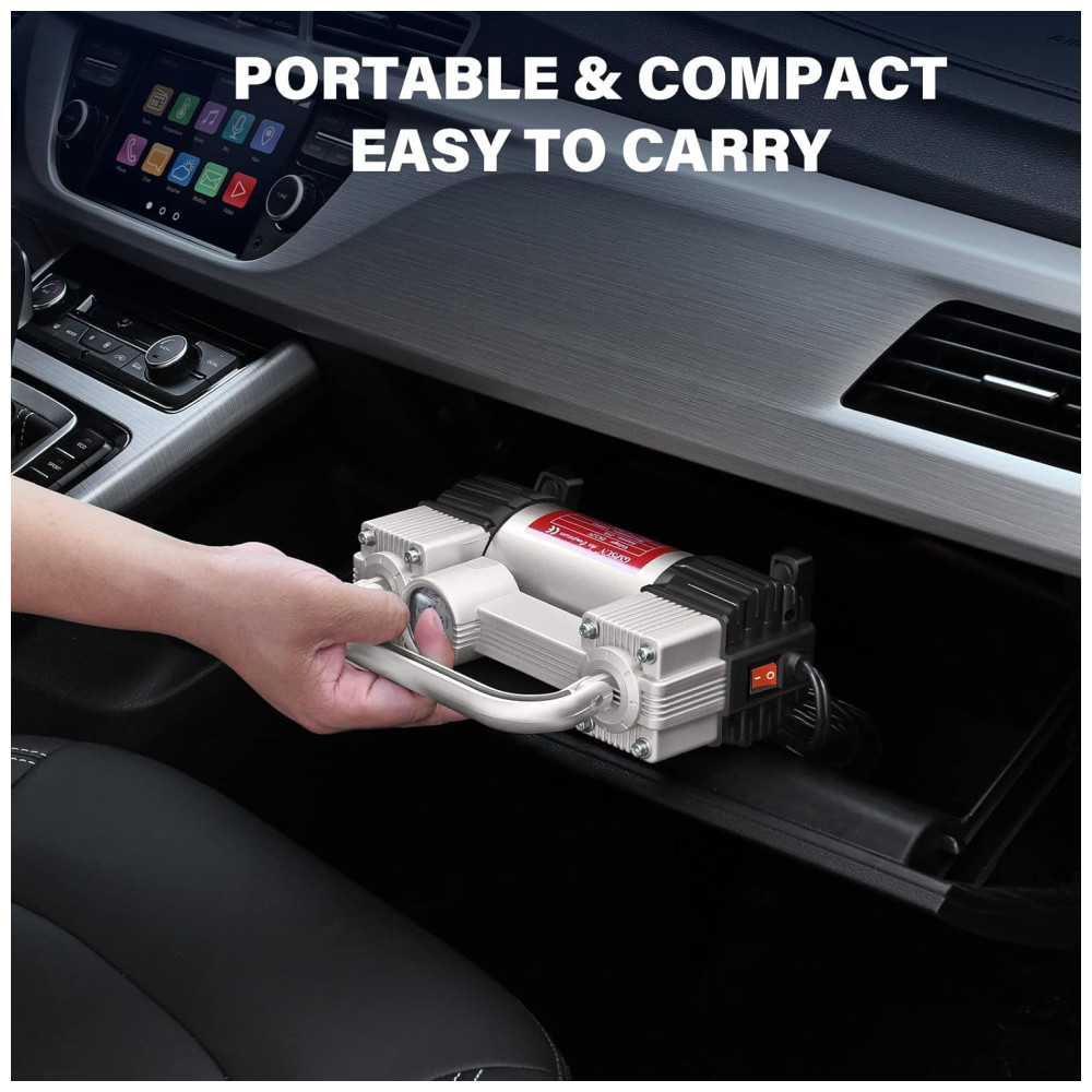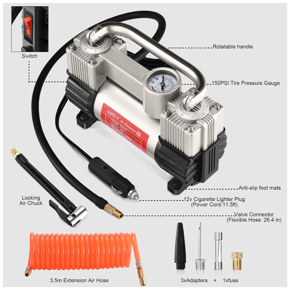 Mini Compressor de Ar Elétrico Automotivo 12V 150 PSI 25 A 110 adaptadores 220v GSPSCN Tire Inflator Heavy Duty Double Prateado