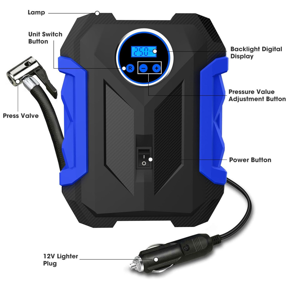 VISOR DIGITAL E ILUMINAÇÃO LED A bomba do compressor de ar portátil Carsun está equipada com um grande visor de alta precisão e brilho para ajudá lo a verificar a pressão dos pneus e predefinir os valores de pressão dos pneus. O inflador de pneu digital é equipado com luzes LED brilhantes e duradouras que podem ser facilmente usadas mesmo no escuro, para que você possa encher novamente à noite ou vê lo rapidamente em estradas rurais remotas e escuras.