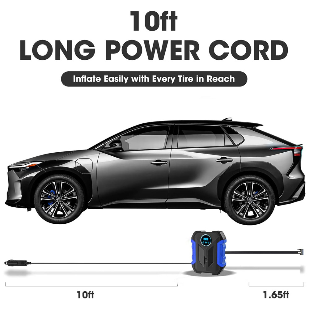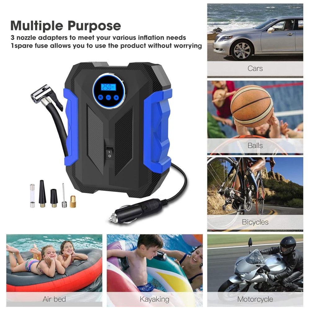 MULTI PROPÓSITO A bomba do compressor de ar Carsun tem um cabo de alimentação de 10 pés e adaptadores infláveis 3 bicos adicionais permitindo alcançar todos os pneus do seu carro, bicicleta, motor, ATV, Sedan compacto ou médio, SUV, colchão de ar, infláveis barcos, bolas e outros insufláveis, mas não suportam camiões grandes ou camiões a motor