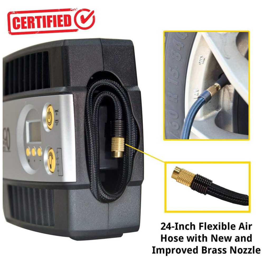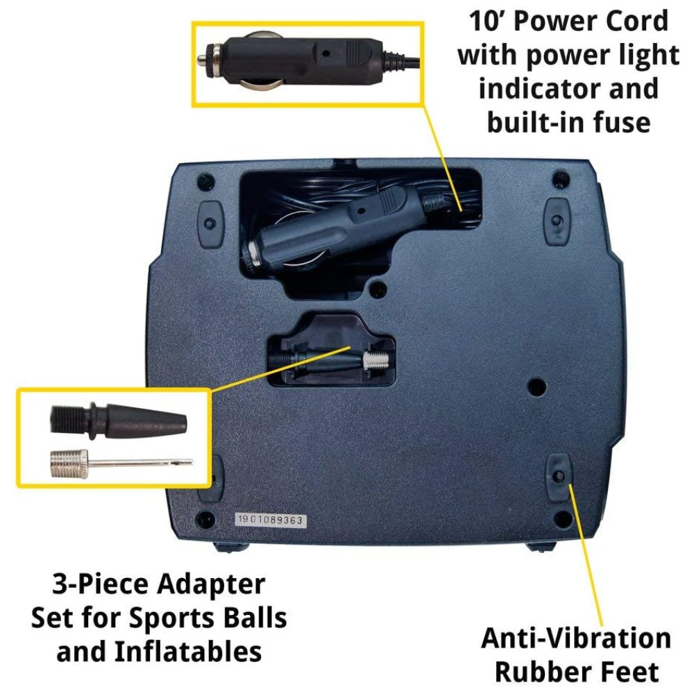 Equipado com um cabo de alimentação de de longo alcance para fácil acesso a cada pneu inclui adaptador de energia de qualidade premium que se conecta diretamente a qualquer tomada acessória de 12 volts DC em seu carro, caminhão ou SUV