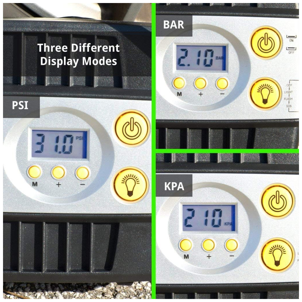 O medidor de ar digital integrado de precisão apresenta um display LCD brilhante com luz de fundo para uso noturno, medindo 0 100 PSI com precisão de 1 PSI infla o ar a uma taxa impressionante de 25L , min.