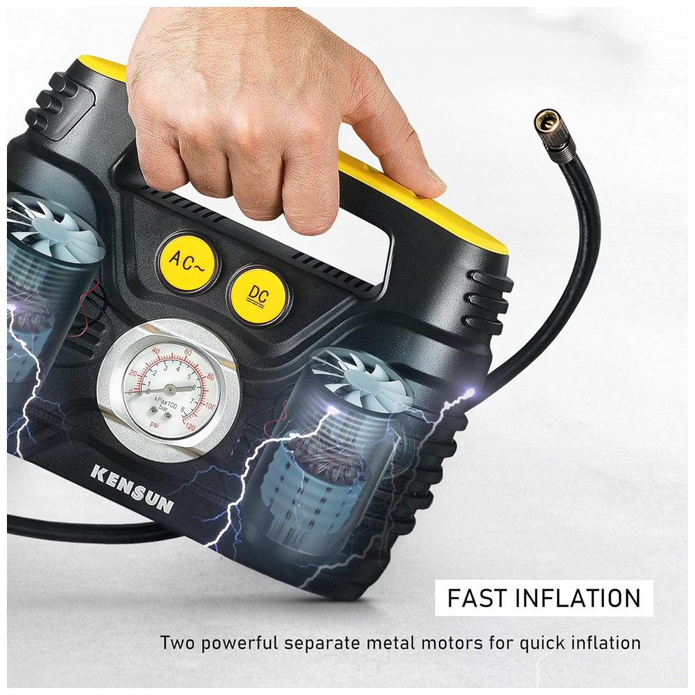 INFLAÇÃO RÁPIDA motores duplos de metal sólido fornecem potência excelente, o que tornará a inflação do pneu super rápida e fácil.