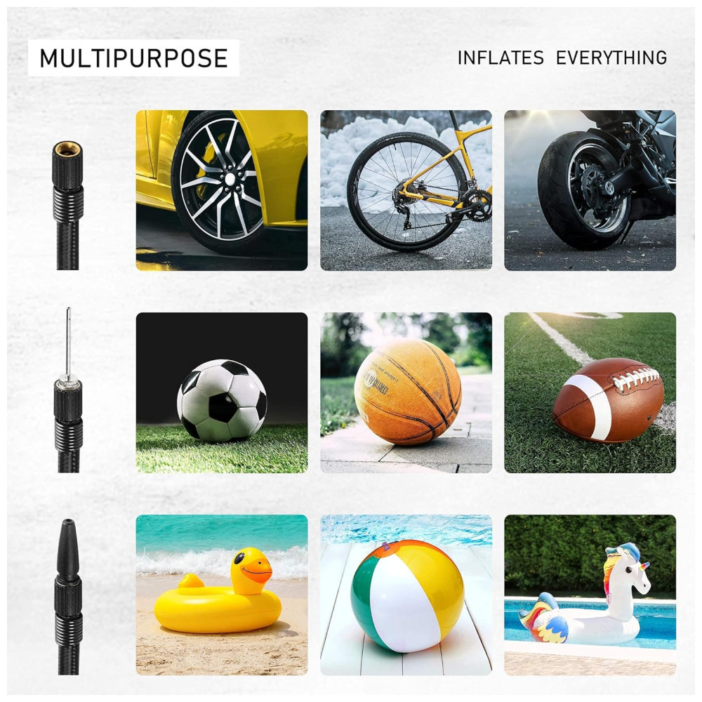 MULTI PROPÓSITO Inflar pneus de carros, bicicletas, sedan e SUV de médio porte. Adaptadores para bolas e infláveis incluídos, além dos recursos AC , DC exclusivos tornam este inflador útil em qualquer situação. Adaptador de válvula Schrader não incluído.