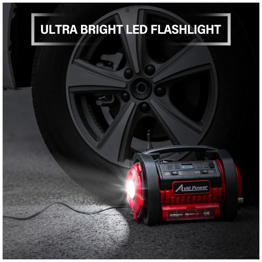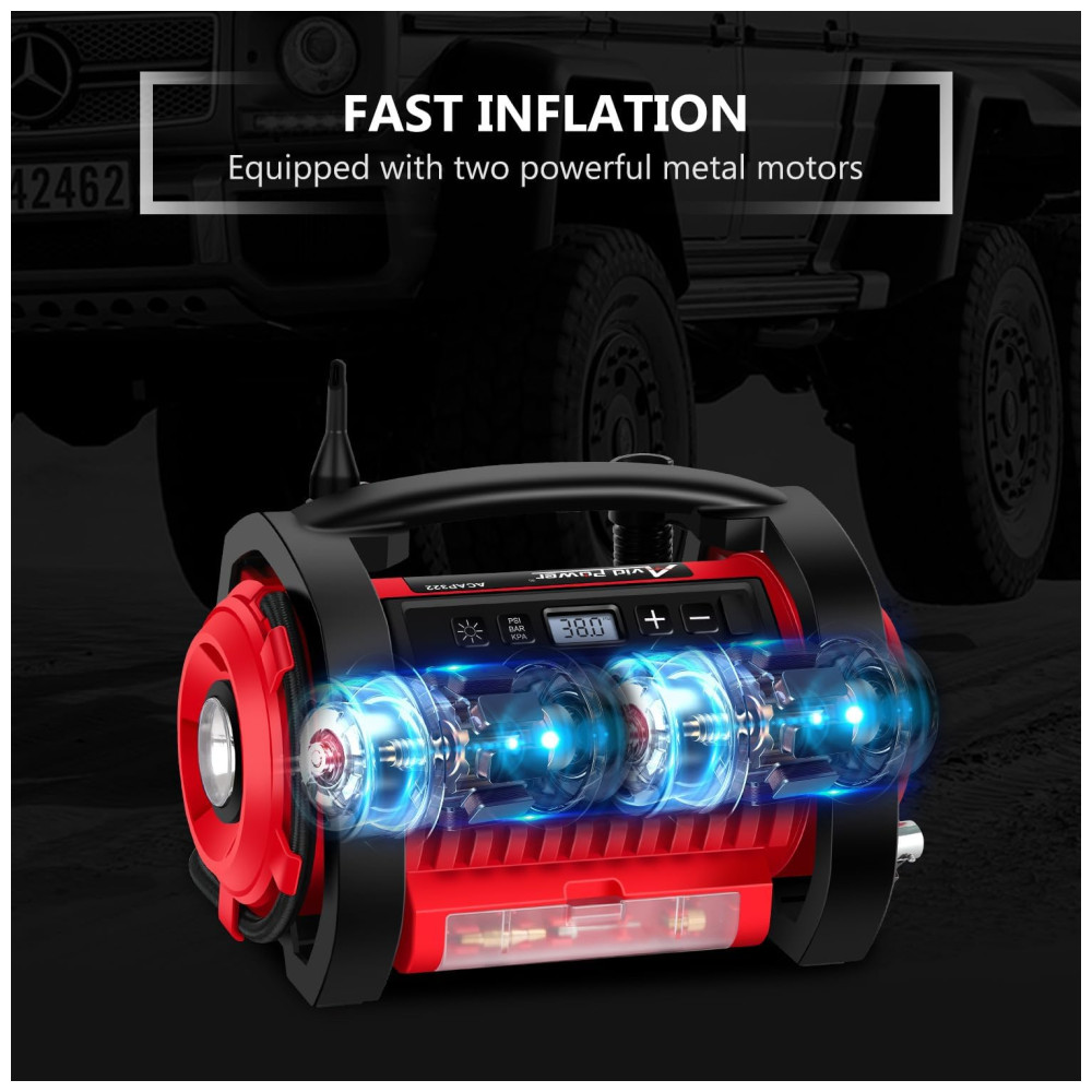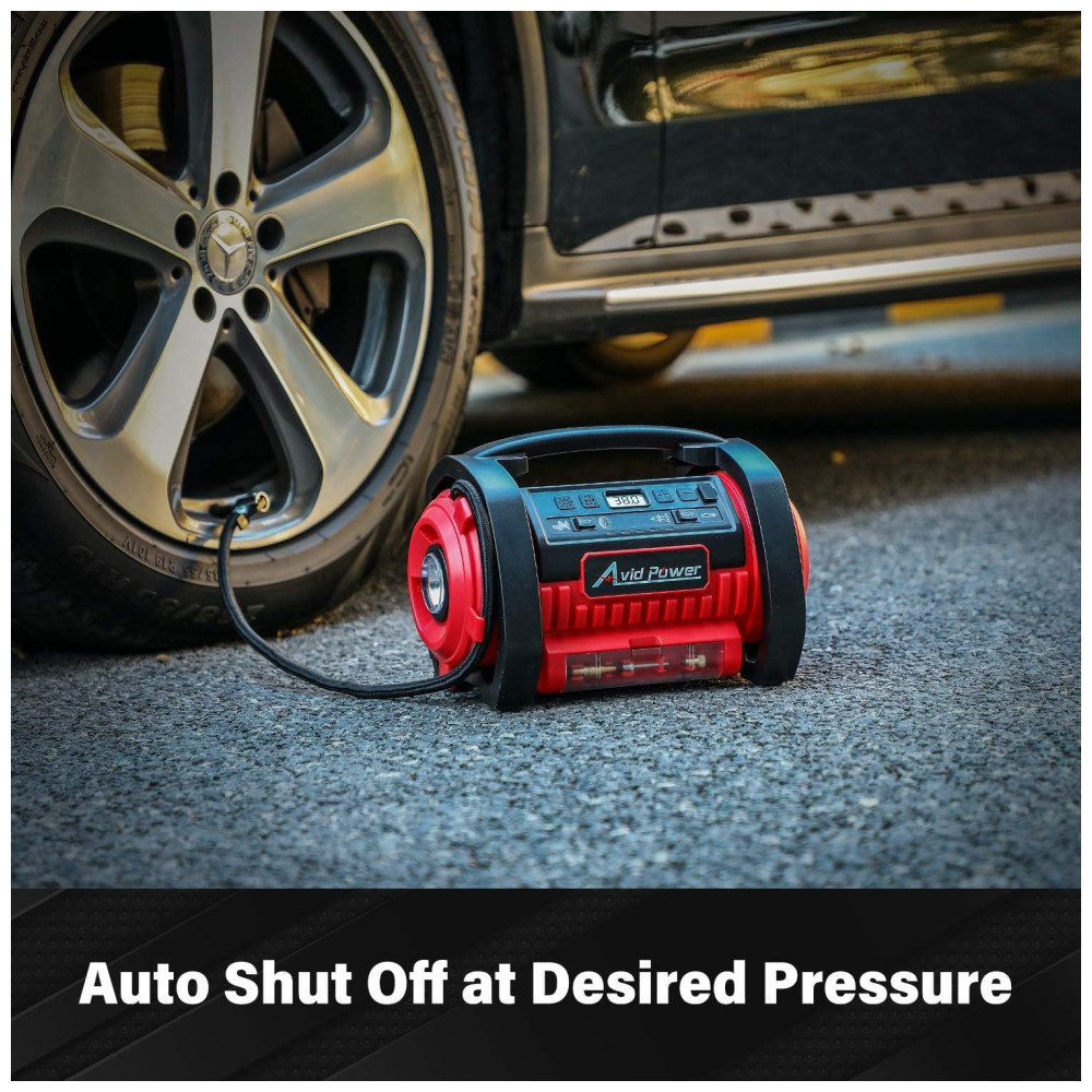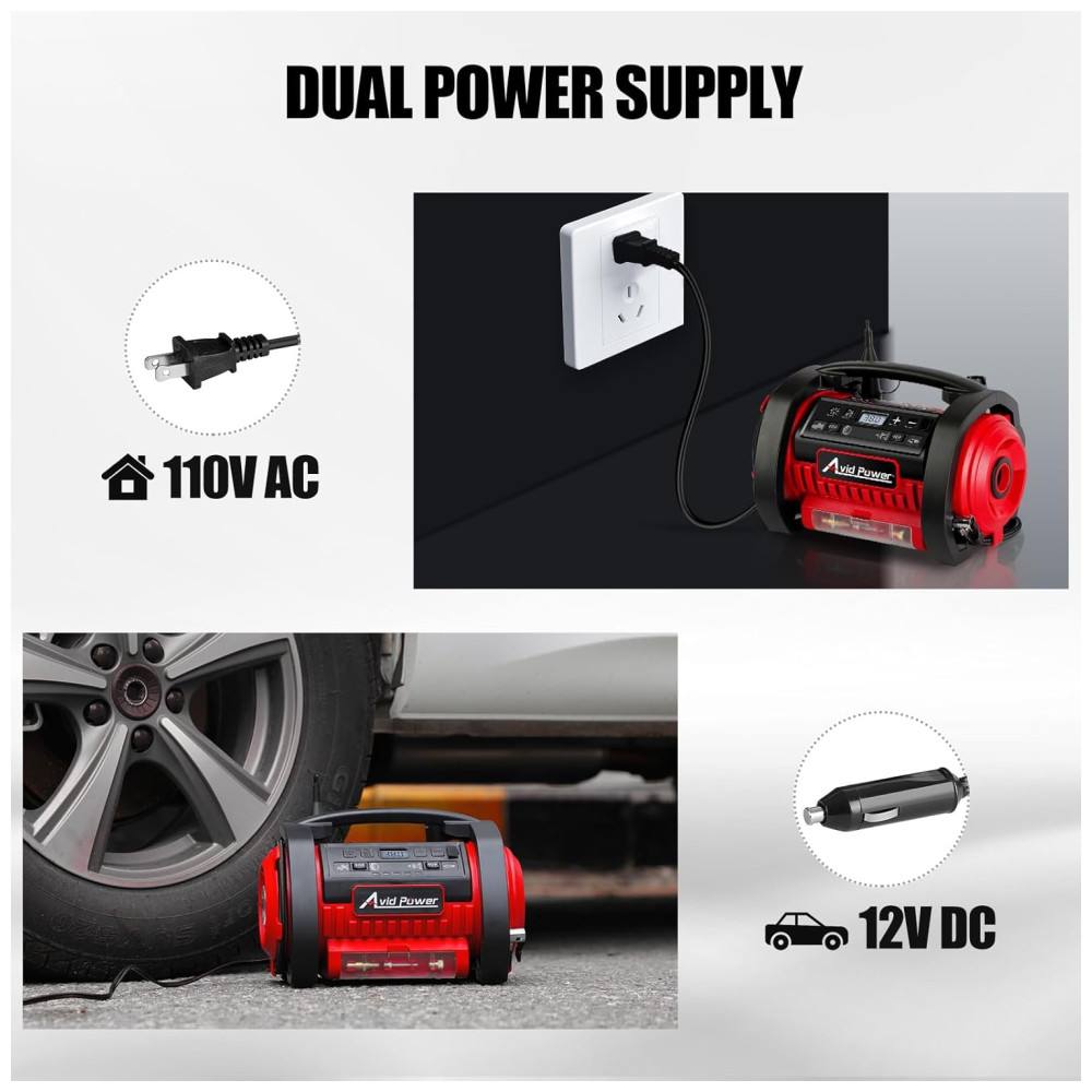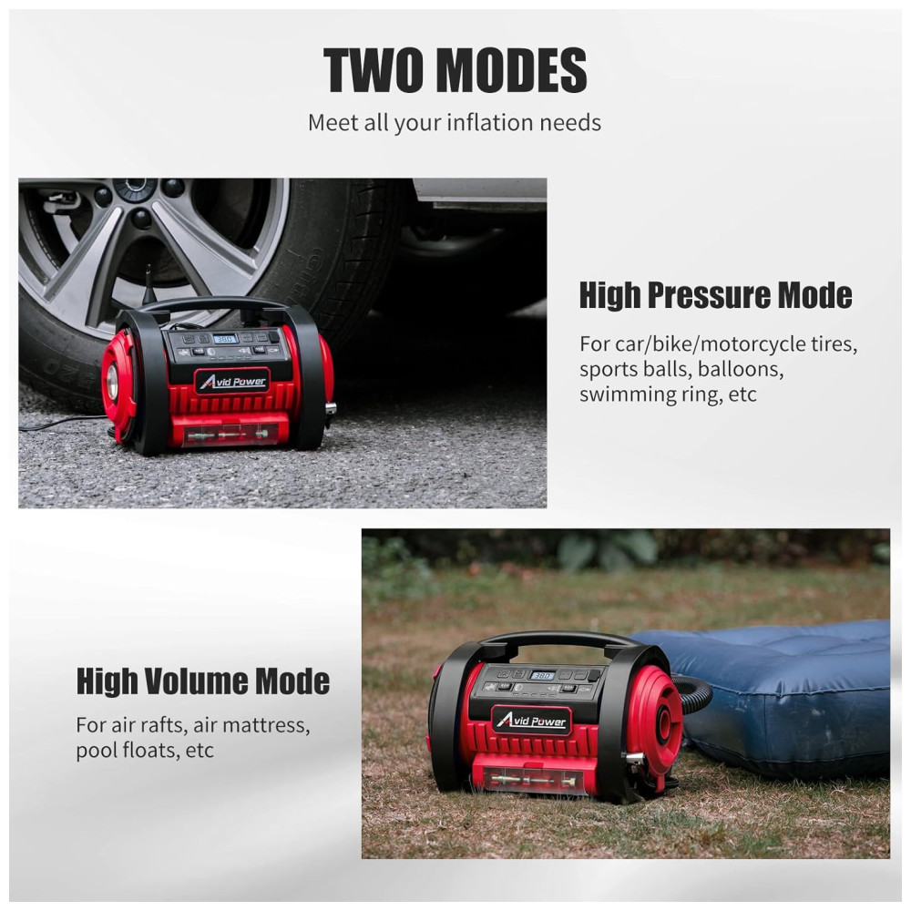 Inflação super rápida O inflador de pneus AC , DC Avid Power vem com motores duplos de metal sólido, que fornecem superpotência e enchem os pneus do carro ou outros infláveis mais rápido. Adequado para inflar pneus em carros, bicicletas, sedan, SUV de médio porte. NÃO SUPORTA pneus de caminhões pesados.