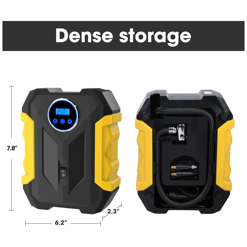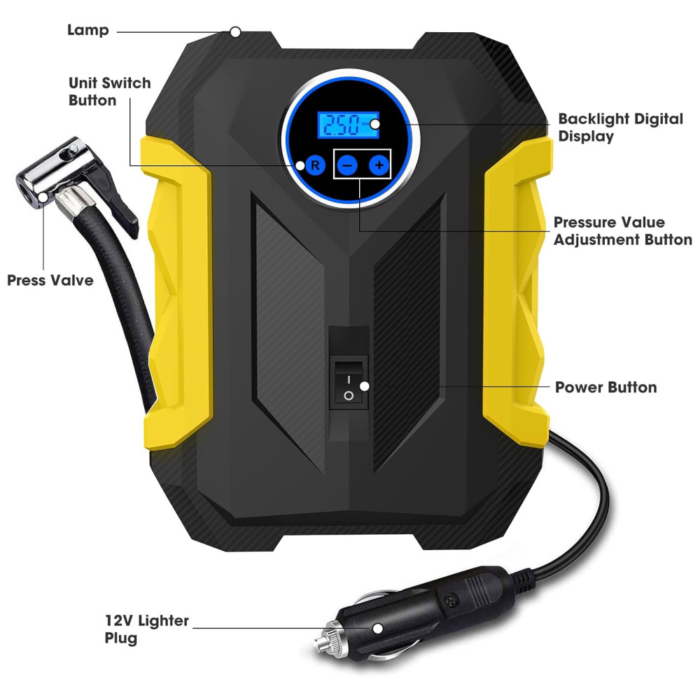 Mini Compressor de Ar Elétrico Automotivo Portátil 12V 150 PSI com Luz LED CARSUN Amarelo