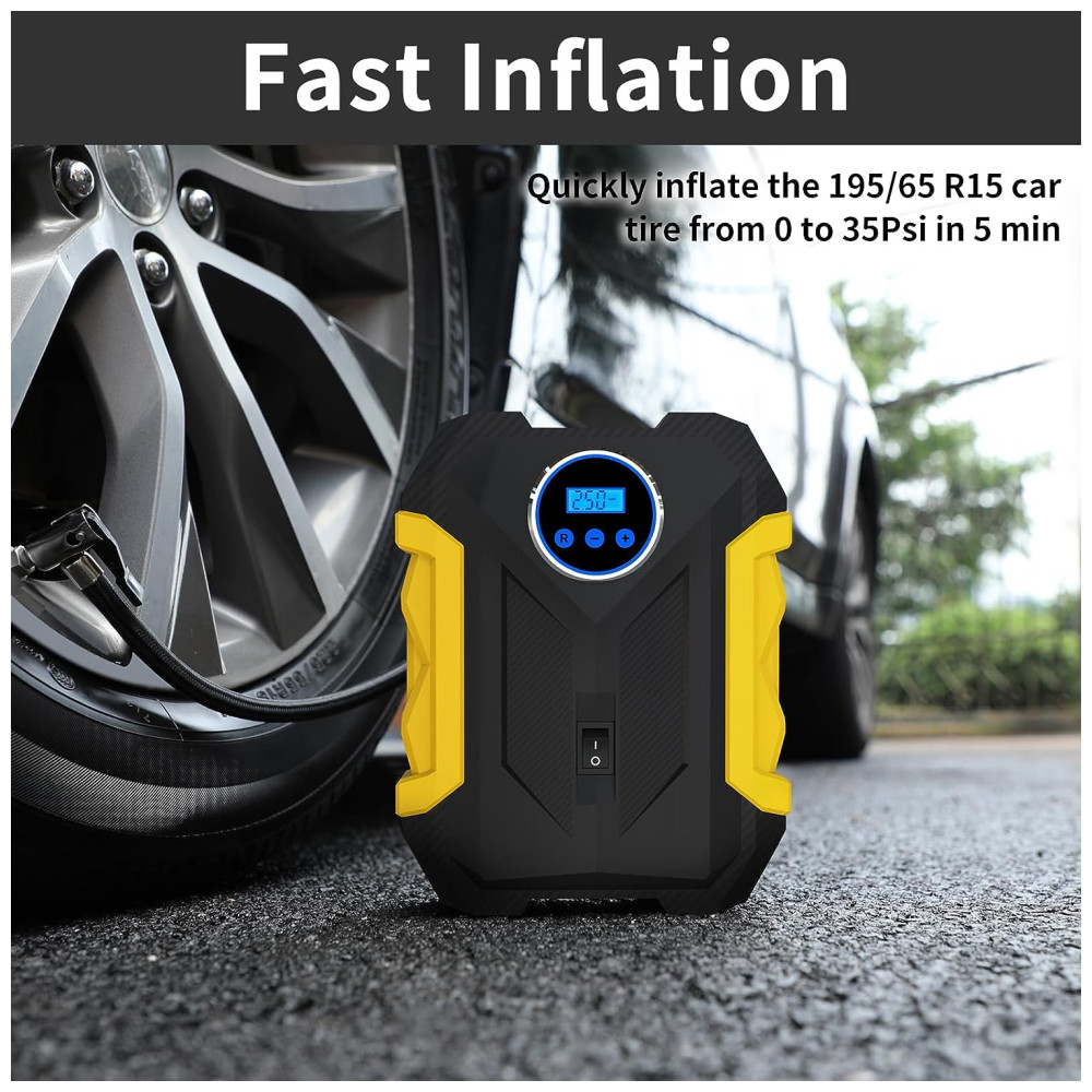 PRESSÃO MÁXIMA DE TRABALHO DE 150 PSI Com pressão máxima de 150 PSI e fluxo de ar 35L , min. Ele pode inflar o pneu de carro 195, 55 R15 de 0 a 35 psi em 5 minutos. Muito mais eficaz e rápida do que a bomba tradicional. Medidor de pressão de pneu preciso integrado.