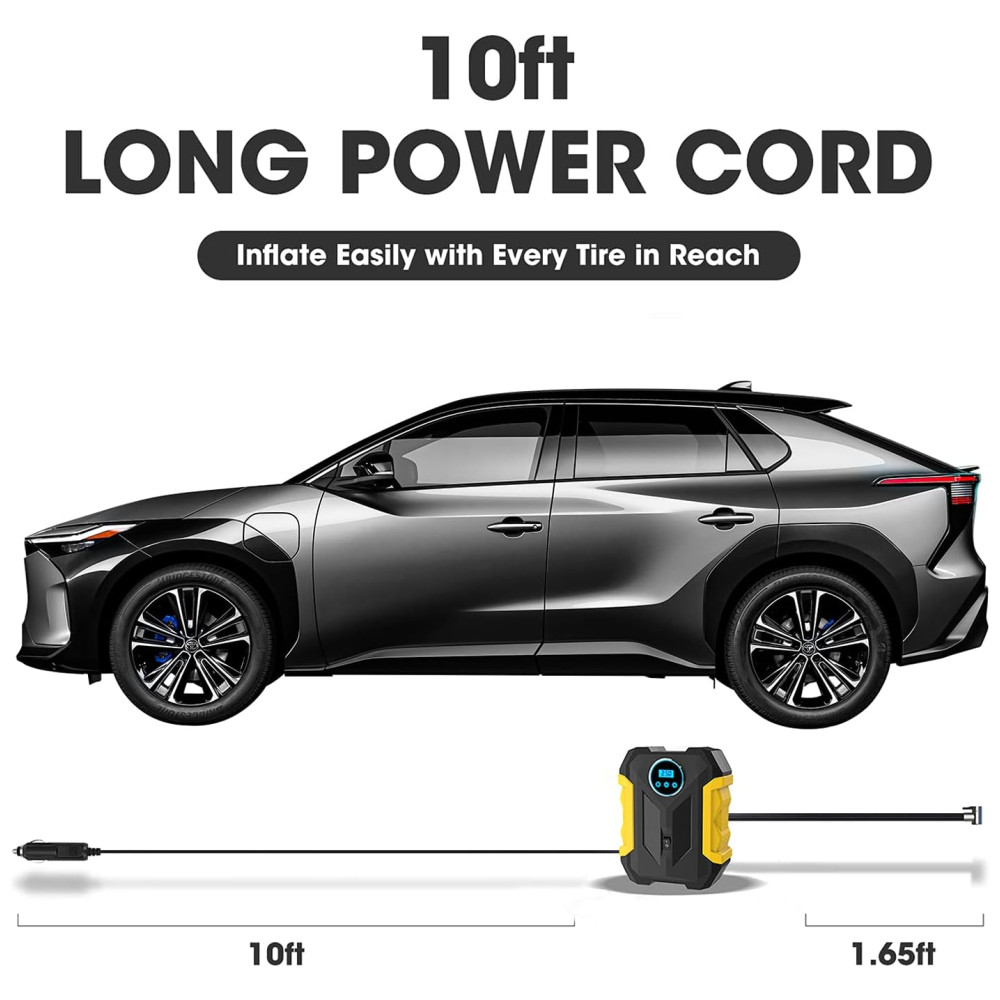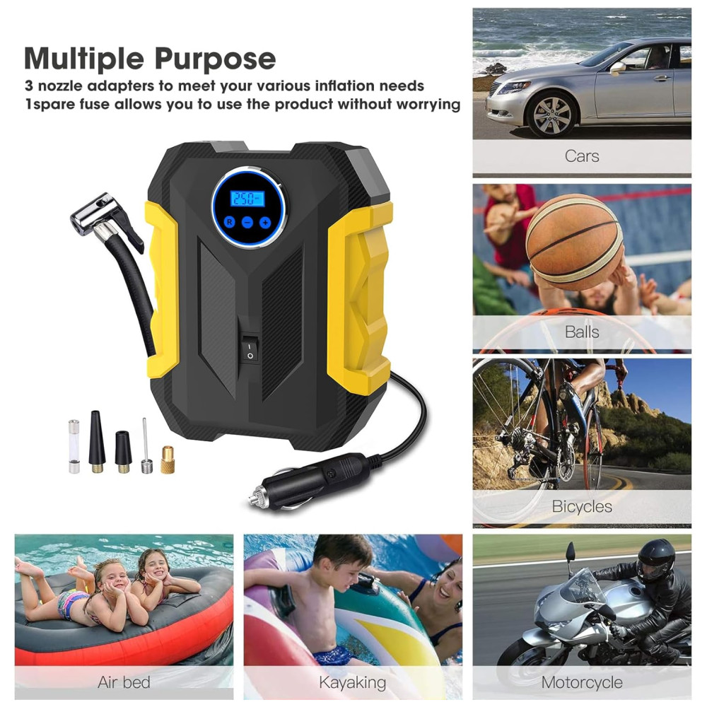 MULTI PROPÓSITO A bomba do compressor de ar Carsun tem um cabo de alimentação de e adaptadores infláveis 3 bicos adicionais permitindo alcançar todos os pneus do seu carro, bicicleta, motor, ATV, Sedan compacto ou médio, SUV, colchão de ar, infláveis barcos, bolas e outros insufláveis, mas não suportam camiões grandes ou camiões a motor