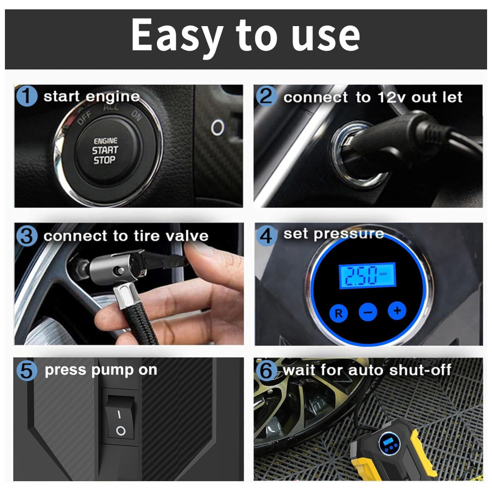 FÁCIL DE USAR E DESLIGAMENTO AUTOMÁTICO Conecte o cabo de alimentação do compressor de ar portátil Carsun na tomada de alimentação de 12 V do carro, pressione o bico de enchimento na válvula do pneu, defina o valor de pressão exigido pelo pneu e pressione o interruptor para começar a inflar. A bomba do compressor de ar desligará automaticamente ao atingir a pressão do pneu desejada.