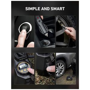 INFLAÇÃO RÁPIDA E OPERAÇÃO RÁPIDA Este compressor de ar para pneus automotivos pode inflar os pneus do seu carro em segundos. Ligue o à tomada de 12 V do seu carro e prenda a haste à válvula do pneu. Um simples toque no compressor de ar do carro fará todo o trabalho por você. Uma ótima solução para emergências no caminho.
